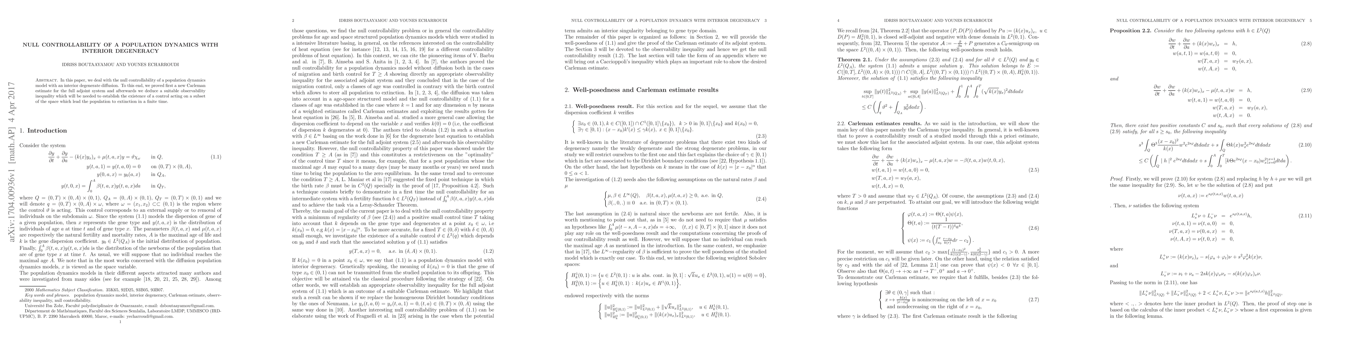 In this paper, we deal with the null controllability of a population dynamics model with an interior degenerate diffusion. To this end, we proved first a new Carleman estimate for the full adjoint system and afterwards we deduce a suitable observability inequality which will be needed to establish the existence of a control acting on a subset of the space which lead the population to extinction in a finite time.