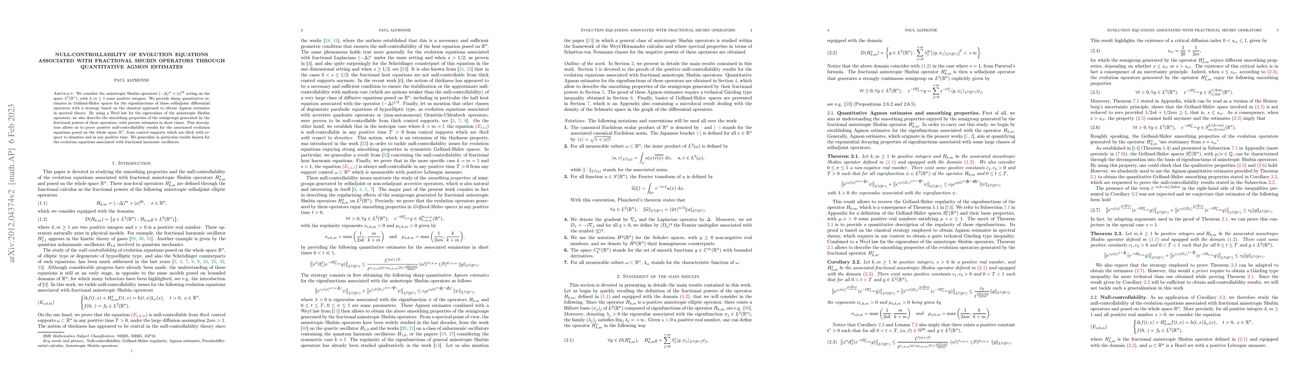 We consider the anisotropic Shubin operators $(-\Delta)^m + \vert x\vert^{2k}$ acting on the space $L^2(\mathbb R^n)$, with $k, m \geq1$ some positive integers. We provide sharp quantitative estimates in Gelfand-Shilov spaces for the eigenfunctions of these selfadjoint differential operators, that is, exponential decay estimates both for these functions and their Fourier transforms in $L^2(\mathbb R^n)$. The strategy implemented is based on the classical approach to obtain Agmon estimates in spectral theory. By using a Weyl law for the eigenvalues of the anisotropic Shubin operators, we also describe the smoothing properties of the semigroups generated by the fractional powers of these operators, with precise estimates in short times. This description allows us to prove positive null-controllability results for the associated evolution equations posed on the whole space $\mathbb R^n$, from control supports which are thick with respect to densities and in any positive time. We generalize in particular results known for the evolution equations associated with fractional harmonic oscillators.