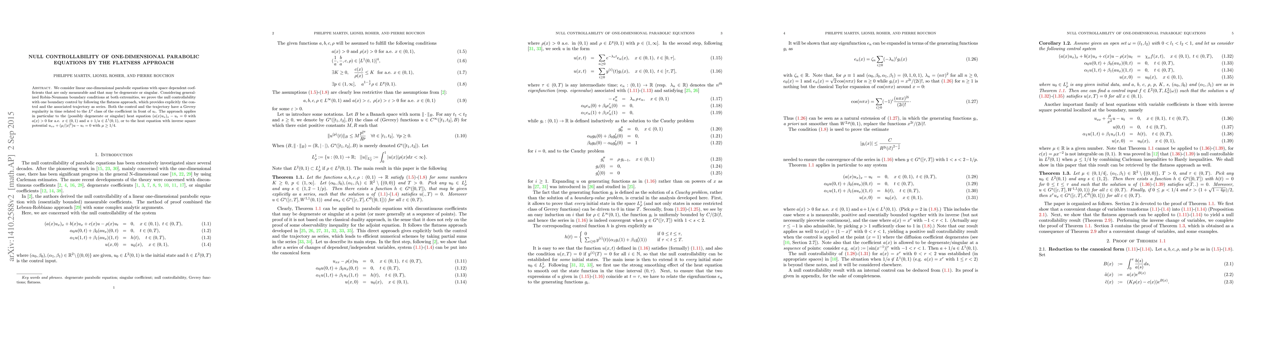 We consider linear one-dimensional parabolic equations with space dependent coefficients that are only measurable and that may be degenerate or singular.Considering generalized Robin-Neumann boundary conditions at both extremities, we prove the null controllability with one boundary control by following the flatness approach, which providesexplicitly the control and the associated trajectory as series. Both the control and the trajectory have a Gevrey regularity in time related to the $L^p$ class of the coefficient in front of $u\_t$.The approach applies in particular to the (possibly degenerate or singular) heat equation $(a(x)u\_x)\_x-u\_t=0$ with $a(x)\textgreater{}0$ for a.e. $x\in (0,1)$ and $a+1/a \in L^1(0,1)$, or to the heat equation with inverse square potential $u\_{xx}+(\mu / |x|^2)u-u\_t=0$with $\mu\ge 1/4$.