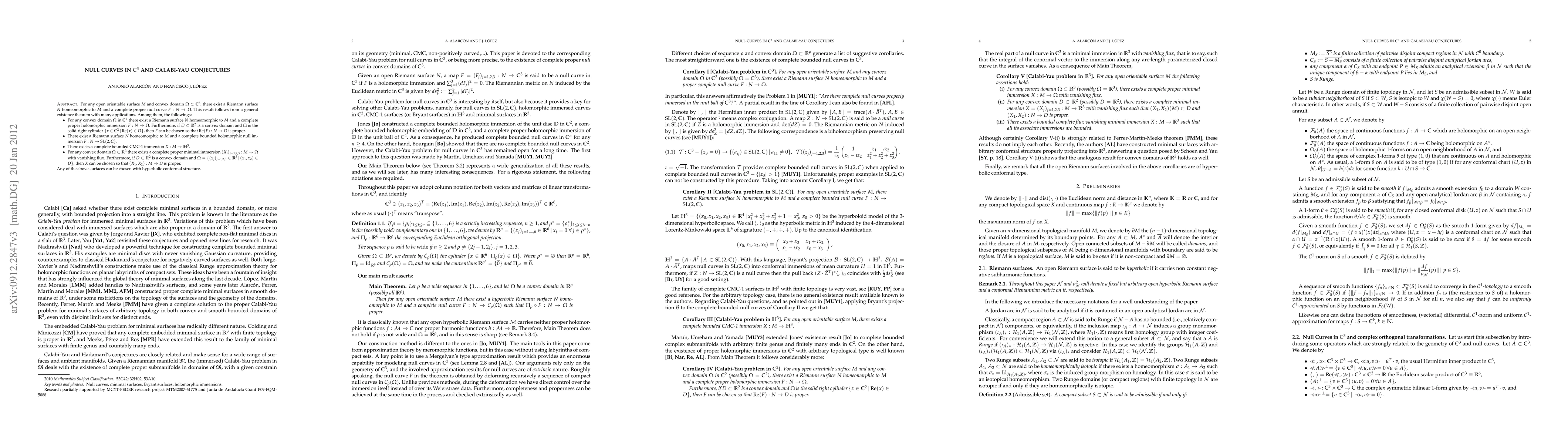 For any open orientable surface $M$ and convex domain $\Omega\subset \mathbb{C}^3,$ there exists a Riemann surface $N$ homeomorphic to $M$ and a complete proper null curve $F:N\to\Omega.$ This result follows from a general existence theorem with many applications. Among them, the followings: For any convex domain $\Omega$ in $\mathbb{C}^2$ there exist a Riemann surface $N$ homeomorphic to $M$ and a complete proper holomorphic immersion $F:N\to\Omega.$ Furthermore, if $D \subset \mathbb{R}^2$ is a convex domain and $\Omega$ is the solid right cylinder $\{x \in \mathbb{C}^2 | {Re}(x) \in D\},$ then $F$ can be chosen so that ${\rm Re}(F):N\to D$ is proper. There exists a Riemann surface $N$ homeomorphic to $M$ and a complete bounded holomorphic null immersion $F:N \to {\rm SL}(2,\mathbb{C}).$ There exists a complete bounded CMC-1 immersion $X:M \to \mathbb{H}^3.$ For any convex domain $\Omega \subset \mathbb{R}^3$ there exists a complete proper minimal immersion $(X_j)_{j=1,2,3}:M \to \Omega$ with vanishing flux. Furthermore, if $D \subset \mathbb{R}^2$ is a convex domain and $\Omega=\{(x_j)_{j=1,2,3} \in \mathbb{R}^3 | (x_1,x_2) \in D\},$ then $X$ can be chosen so that $(X_1,X_2):M\to D$ is proper. Any of the above surfaces can be chosen with hyperbolic conformal structure.