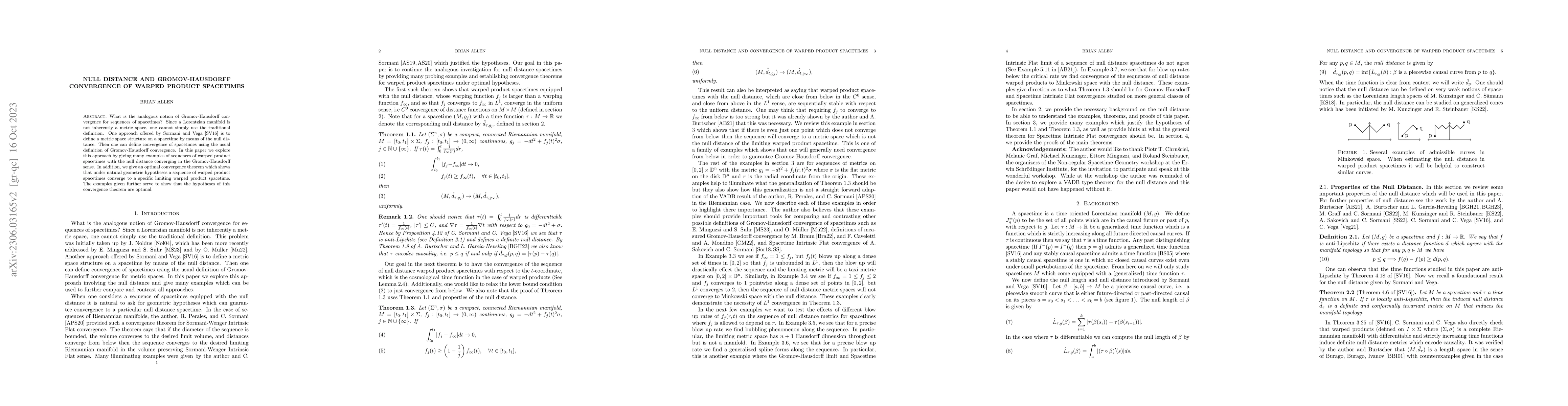This paper investigates the Gromov-Hausdorff convergence of sequences of warped product spacetimes using the null distance to define a metric structure. It provides examples and proves an optimal convergence theorem under natural geometric conditions.