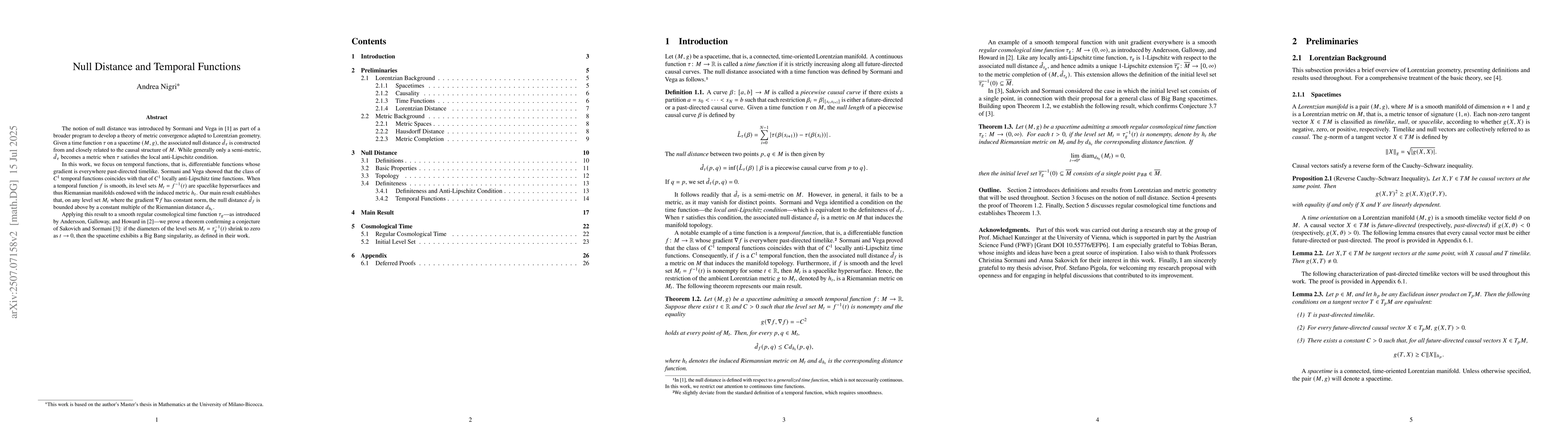 The notion of null distance was introduced by Sormani and Vega as part of a broader program to develop a theory of metric convergence adapted to Lorentzian geometry. Given a time function $\tau$ on a spacetime $(M,g)$, the associated null distance $\hat{d}_\tau$ is constructed from and closely related to the causal structure of $M$. While generally only a semi-metric, $\hat{d}_\tau$ becomes a metric when $\tau$ satisfies the local anti-Lipschitz condition. In this work, we focus on temporal functions, that is, differentiable functions whose gradient is everywhere past-directed timelike. Sormani and Vega showed that the class of $C^1$ temporal functions coincides with that of $C^1$ locally anti-Lipschitz time functions. When a temporal function $f$ is smooth, its level sets $M_t = f^{-1}(t)$ are spacelike hypersurfaces and thus Riemannian manifolds endowed with the induced metric $h_t$. Our main result establishes that, on any level set $M_t$ where the gradient $\nabla f$ has constant norm, the null distance $\hat{d}_f$ is bounded above by a constant multiple of the Riemannian distance $d_{h_t}$. Applying this result to a smooth regular cosmological time function $\tau_g$ -- as introduced by Andersson, Galloway, and Howard -- we prove a theorem confirming a conjecture of Sakovich and Sormani (arXiv:2410.16800, 2025): if the diameters of the level sets $M_t = \tau_g^{-1}(t)$ shrink to zero as $t \to 0$, then the spacetime exhibits a Big Bang singularity, as defined in their work.
