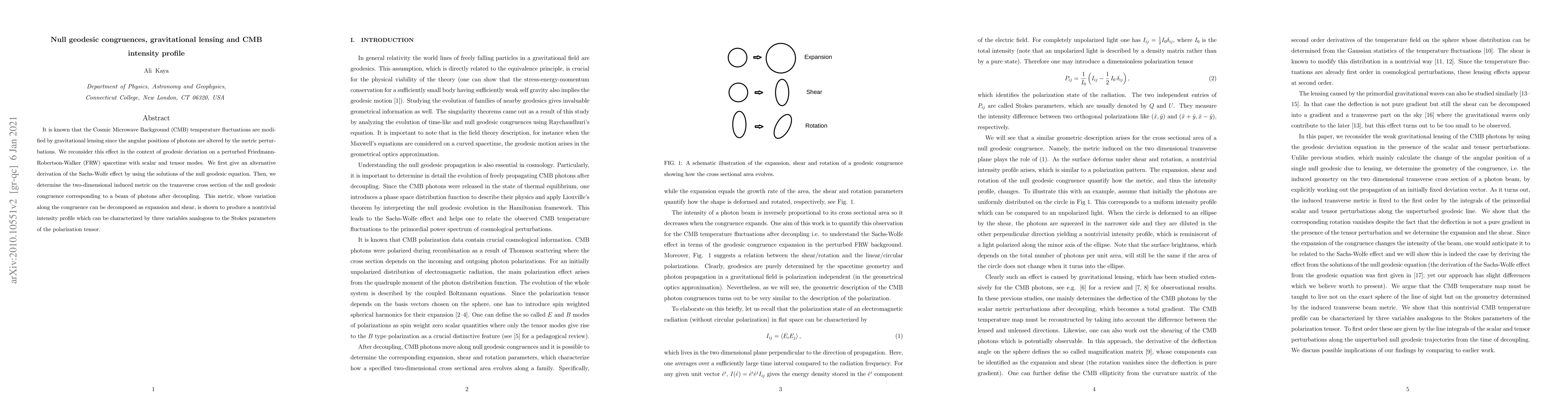 It is known that the Cosmic Microwave Background (CMB) temperature fluctuations are modified by gravitational lensing since the angular positions of photons are altered by the metric perturbations. We reconsider this effect in the context of geodesic deviation on a perturbed Friedmann-Robertson-Walker (FRW) spacetime with scalar and tensor modes. We first give an alternative derivation of the Sachs-Wolfe effect by using the solutions of the null geodesic equation. Then, we determine the two-dimensional induced metric on the transverse cross section of the null geodesic congruence corresponding to a beam of photons after decoupling. This metric, whose variation along the congruence can be decomposed as expansion and shear, is shown to produce a nontrivial intensity profile which can be characterized by three variables analogous to the Stokes parameters of the polarization tensor.