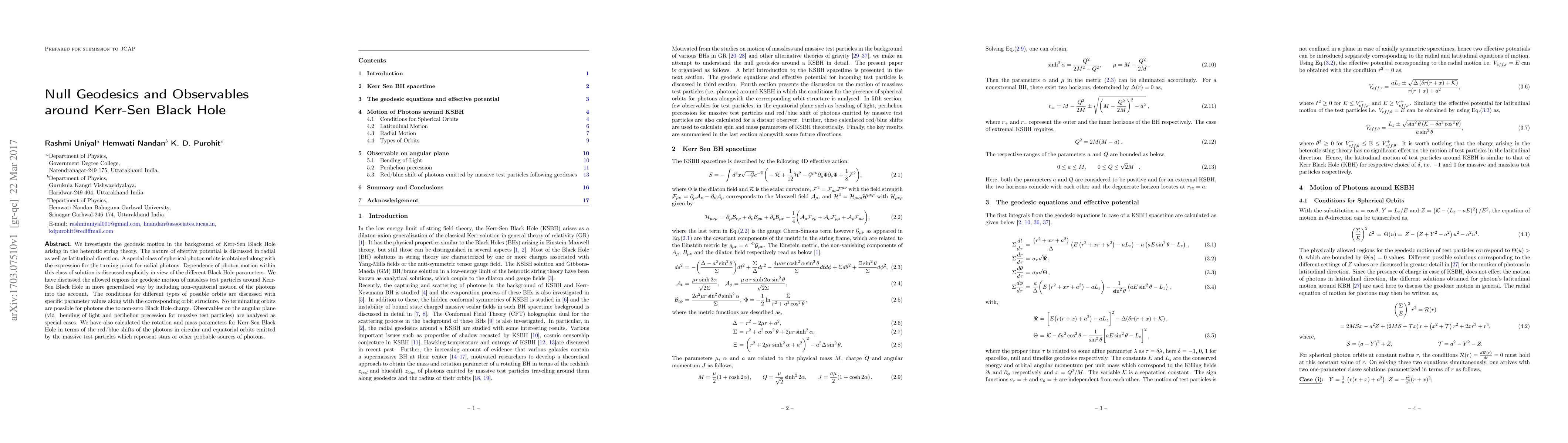 We investigate the geodesic motion in the background of Kerr-Sen Black Hole arising in the heterotic string theory. The nature of effective potential is discussed in radial as well as latitudinal direction. A special class of spherical photon orbits is obtained along with the expression for the turning point for radial photons. Dependence of photon motion within this class of solution is discussed explicitly in view of the different Black Hole parameters. We have discussed the allowed regions for geodesic motion of massless test particles around Kerr- Sen Black Hole in more generalised way by including non-equatorial motion of the photons into the account. The conditions for different types of possible orbits are discussed with specific parameter values along with the corresponding orbit structure. No terminating orbits are possible for photons due to non-zero Black Hole charge. Observables on the angular plane (viz. bending of light and perihelion precession for massive test particles) are analysed as special cases. We have also calculated the rotation and mass parameters for Kerr-Sen Black Hole in terms of the red/blue shifts of the photons in circular and equatorial orbits emitted by the massive test particles which represent stars or other probable sources of photons.