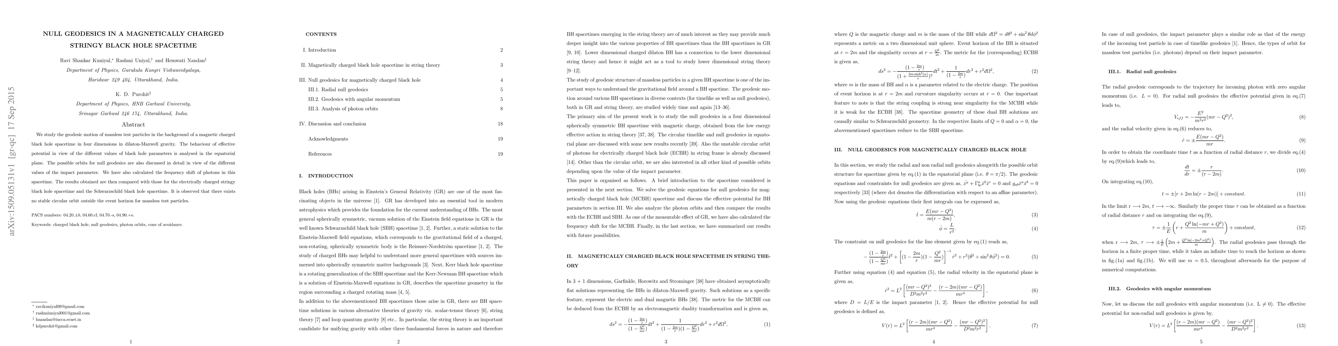 This paper investigates the behavior of null geodesics in the magnetically charged stringy black hole spacetime, analyzing the effective potential and orbit possibilities for massless particles. It finds no stable circular orbits outside the event horizon and compares the results with electrically charged and Schwarzschild black hole spacetimes.