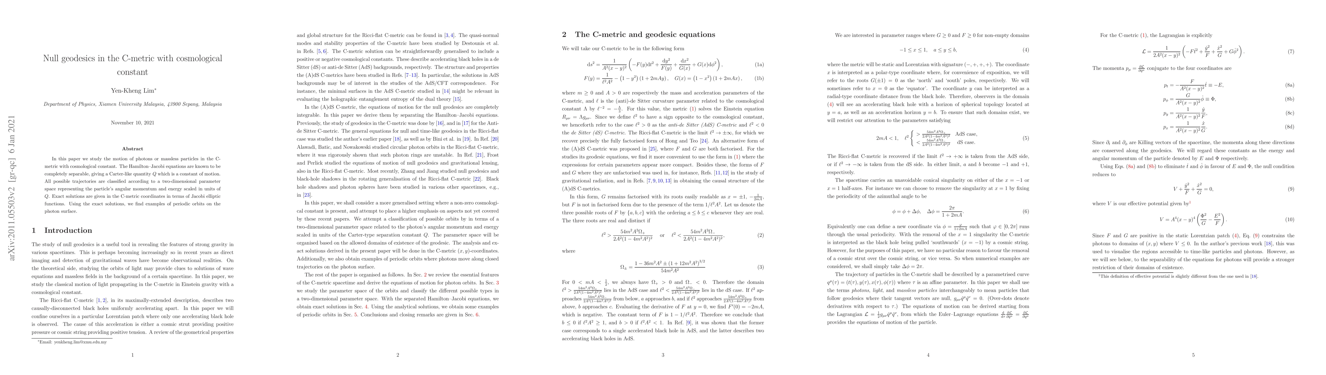 In this paper we study the motion of photons or massless particles in the C-metric with cosmological constant. The Hamilton--Jacobi equations are known to be completely separable, giving a Carter-like quantity $Q$ which is a constant of motion. All possible trajectories are classified according to a two-dimensional parameter space representing the particle's angular momentum and energy scaled in units of $Q$. Exact solutions are given in the C-metric coordinates in terms of Jacobi elliptic functions. Using the exact solutions, we find examples of periodic orbits on the photon surface.