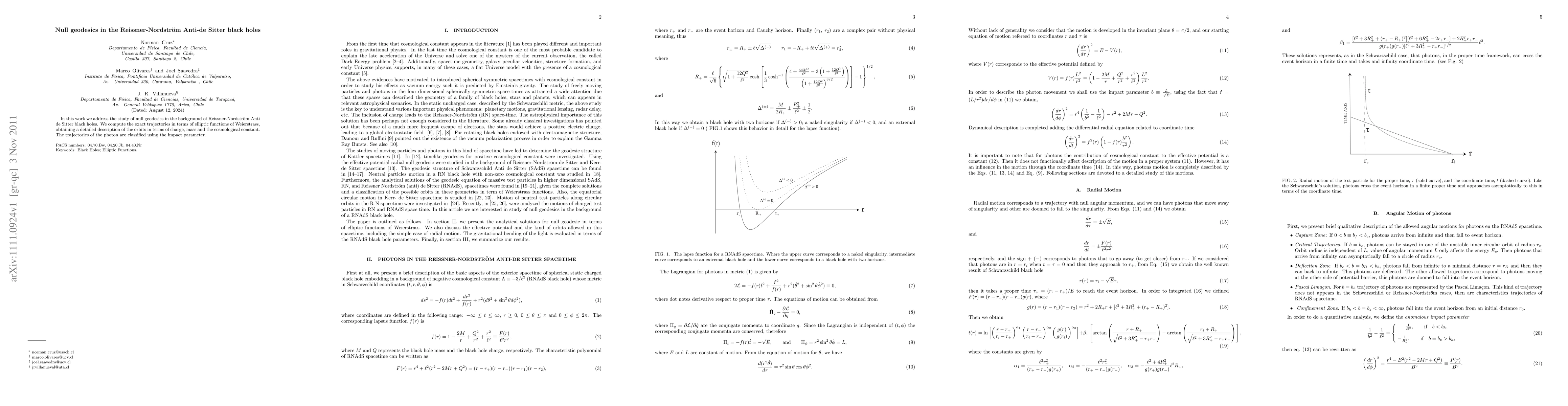 This research computes the exact null geodesics in Reissner-Nordström Anti-de Sitter black holes, employing Weierstrass elliptic functions to describe the photon trajectories in terms of charge, mass, and cosmological constant, and classifies them using the impact parameter.