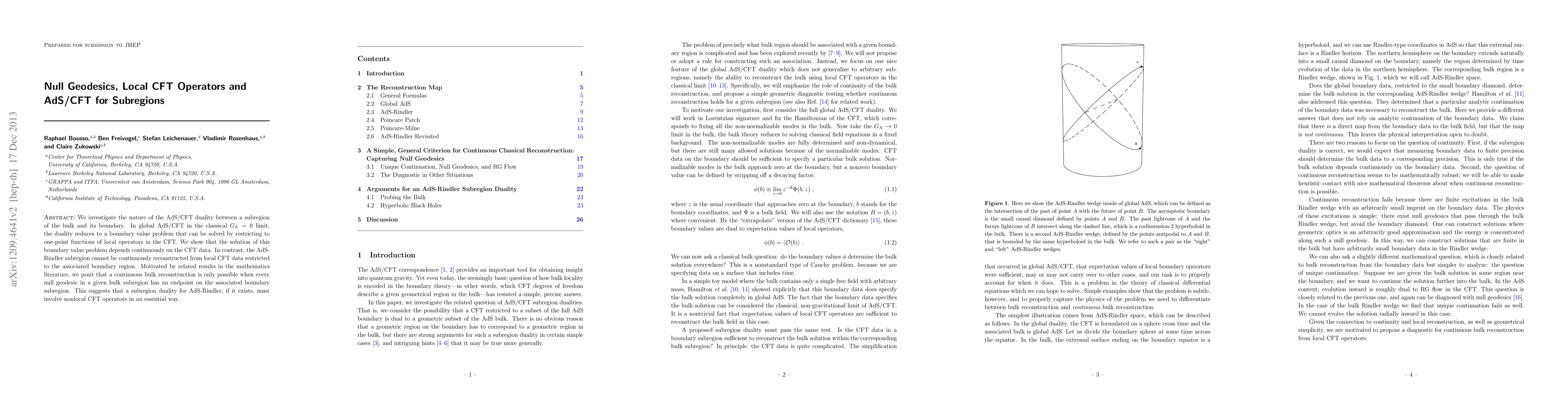 Researchers investigate AdS/CFT duality between subregions of the bulk and their boundaries, finding that continuous reconstruction requires every null geodesic to have an endpoint on the boundary.