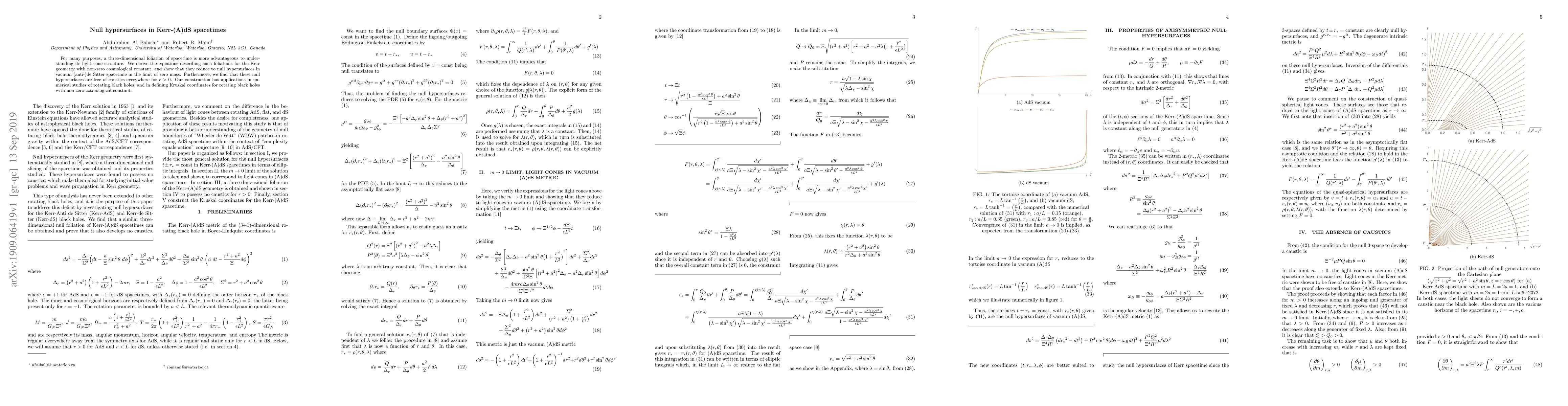 The paper presents a detailed derivation of null hypersurfaces in Kerr-(A)dS spacetimes and proves their caustic-free nature for $r>0$.