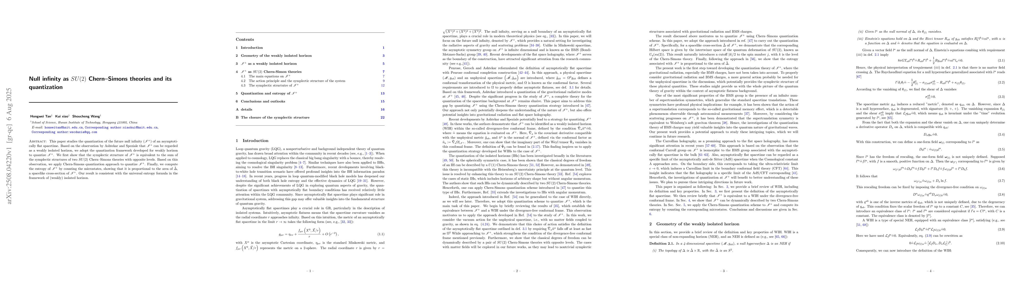 This paper studies the quantization of the future null infinity ($\mathscr{I}^+$) of an asymptotically flat spacetime. Based on the observation by Ashtekar and Speziale that $\mathscr{I}^+$ can be regarded as a weakly isolated horizon, we adopt the quantization framework developed for weakly horizon to quantize $\mathscr{I}^+$. We first show that the symplectic structure of $\mathscr{I}^+$ is equivalent to the sum of the symplectic structures of two $SU(2)$ Chern-Simons theories with opposite levels. Based on this observation, we apply Chern-Simons quantization approach to quantize $\mathscr{I}^+$. Finally, we compute the entropy of $\mathscr{I}^+$ by counting the microstates, showing that it is proportional to the area of $\tilde{\Delta}$, a spacelike cross-section of $\mathscr{I}^+$. Our result is consistent with the universal entropy formula in the framework of (weakly) isolated horizon.
