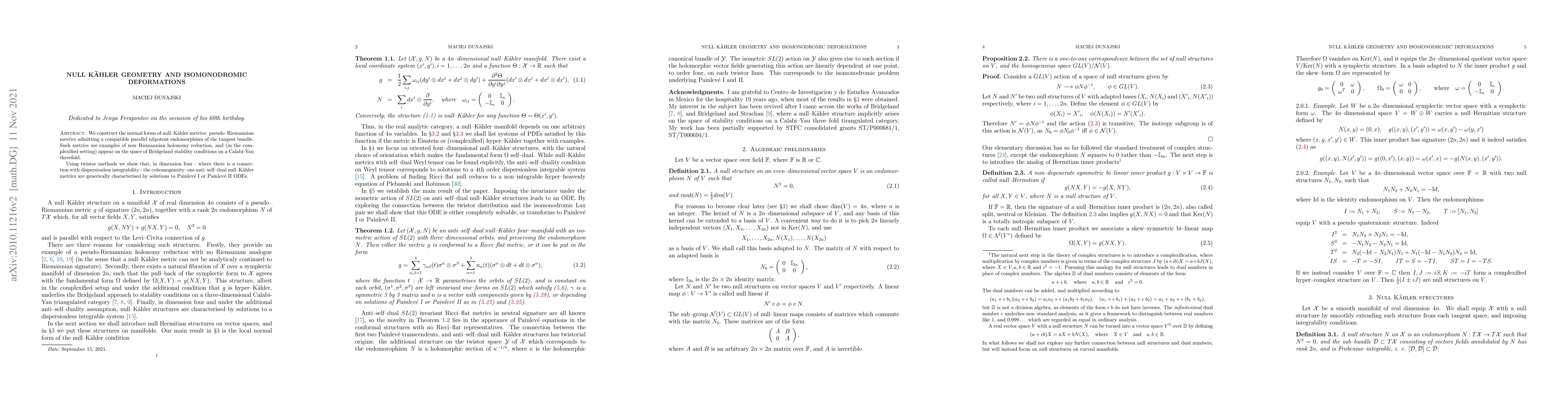 We construct the normal forms of null-K\"ahler metrics: pseudo-Riemannian metrics admitting a compatible parallel nilpotent endomorphism of the tangent bundle. Such metrics are examples of non-Riemannian holonomy reduction, and (in the complexified setting) appear in the Bridgeland stability conditions of the moduli spaces of Calabi-Yau three-folds. Using twistor methods we show that, in dimension four - where there is a connection with dispersionless integrability - the cohomogeneity-one anti-self-dual null-K\"ahler metrics are generically characterised by solutions to Painlev\'e I or Painlev\'e II ODEs.