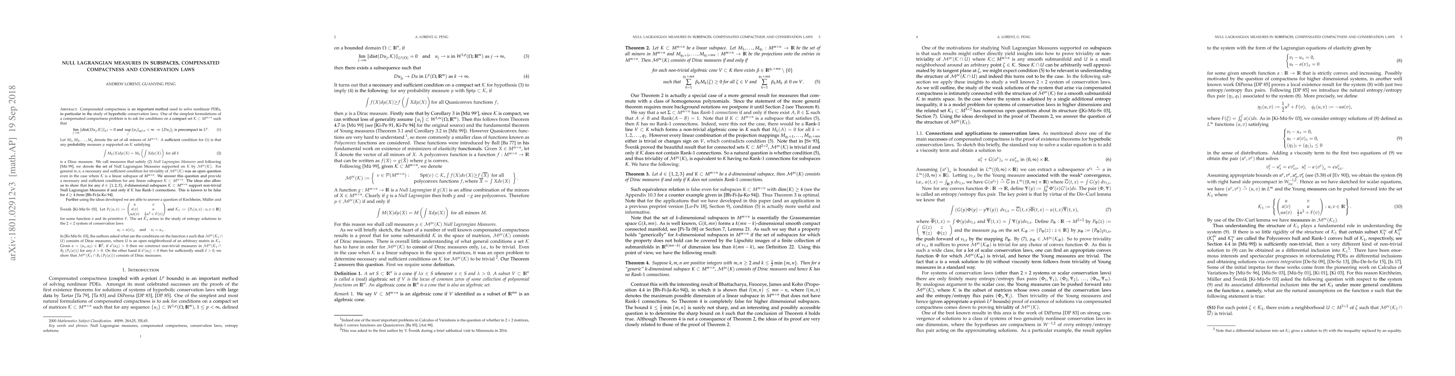 Compensated compactness is an important method used to solve nonlinear PDEs. A simple formulation of a compensated compactness problem is to ask for conditions on a set $\mathcal{K}\subset M^{m\times n}$ such that $$ \lim_{n\rightarrow \infty} \mathrm{dist}(Du_n,\mathcal{K})\overset{L^p}{\rightarrow} 0\; \Rightarrow \{Du_{n}\}_{n}\text{ is precompact.} $$ Let $M_1,M_2,\dots, M_q$ denote the set of minors of $M^{m\times n}$. A sufficient condition for this is that any measure $\mu$ supported on $\mathcal{K}$ satisfying $$ \int M_k(X) d\mu (X)=M_k\left(\int X d\mu (X)\right)\text{ for }k=1,2,\dots, q $$ is a Dirac measure. We call measures that satisfy the above equation "Null Lagrangian Measures" and we denote the set of Null Lagrangian Measures supported on $\mathcal{K}$ by $\mathcal{M}^{pc}(\mathcal{K})$. For general $m,n$, a necessary and sufficient condition for triviality of $\mathcal{M}^{pc}(\mathcal{K})$ was an open question even in the case where $\mathcal{K}$ is a linear subspace of $M^{m\times n}$. We answer this question and provide a necessary and sufficient condition for any linear subspace $\mathcal{K}\subset M^{m\times n}$. The ideas also allow us to show that for any $d\in \left\{1,2,3\right\}$, $d$-dimensional subspaces $\mathcal{K}\subset M^{m\times n}$ support non-trivial Null Lagrangian Measures if and only if $\mathcal{K}$ has Rank-$1$ connections. This is known to be false for $d\ge 4$. Using the ideas developed we are able to answer (up to first order) a question of Kirchheim, M\"{u}ller and Sverak on the Null Lagrangian measures arising in the study of a (one) entropy solution of a $2\times 2$ system of conservation laws that arises in elasticity.