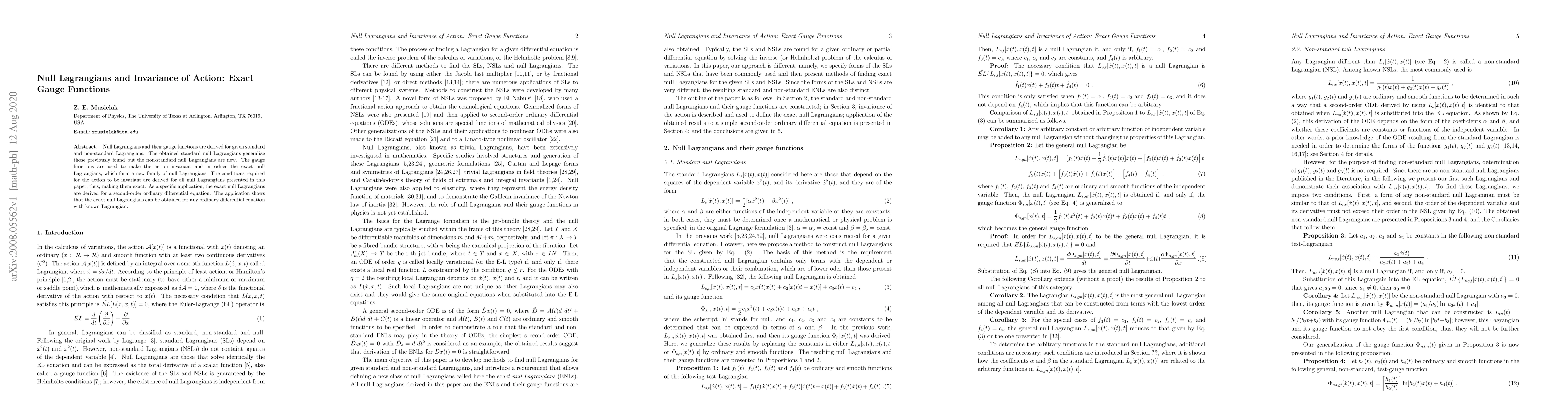 This paper derives standard and new non-standard null Lagrangians, introducing exact null Lagrangians through gauge functions that ensure action invariance. It also applies these findings to second-order ordinary differential equations, demonstrating their general applicability.