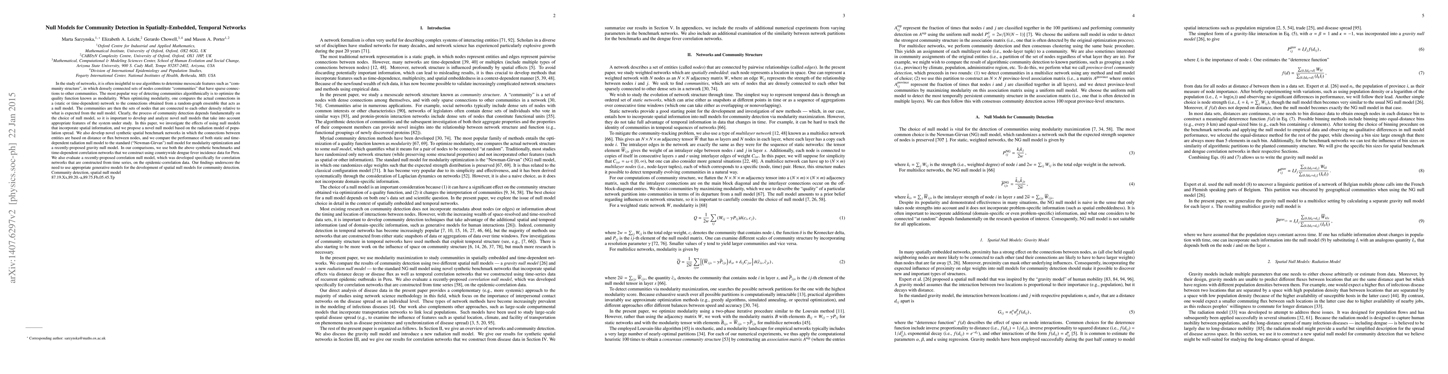 This paper proposes novel null models for detecting community structure in spatially-embedded, temporal networks, focusing on the radiation model of population spread. It evaluates the performance of these models against standard and recently-proposed null models using synthetic spatial benchmarks and real-world dengue fever incidence data from Peru.