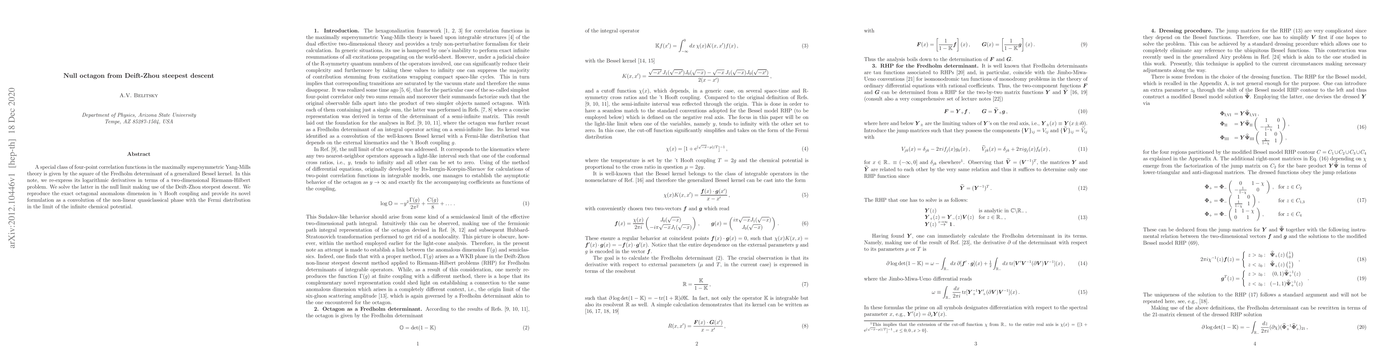 This paper re-expresses logarithmic derivatives of four-point correlation functions in supersymmetric Yang-Mills theory using a Riemann-Hilbert problem, solves it in the null limit via Deift-Zhou steepest descent, and derives the exact octagonal anomalous dimension as a convolution involving the non-linear quasiclassical phase and Fermi distribution.