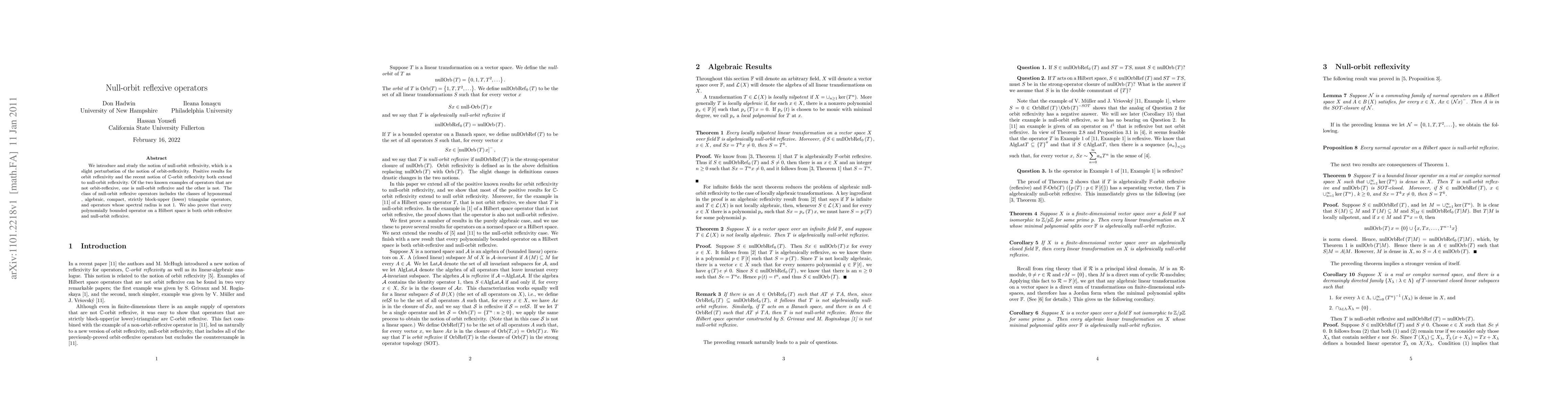 The paper introduces null-orbit reflexivity, a perturbation of orbit-reflexivity, and proves it is equivalent to hyponormality, algebraic compactness, strict block-triangularity, and spectral radius not equal to 1. Null-orbit reflexive operators include all polynomially bounded operators on Hilbert spaces.