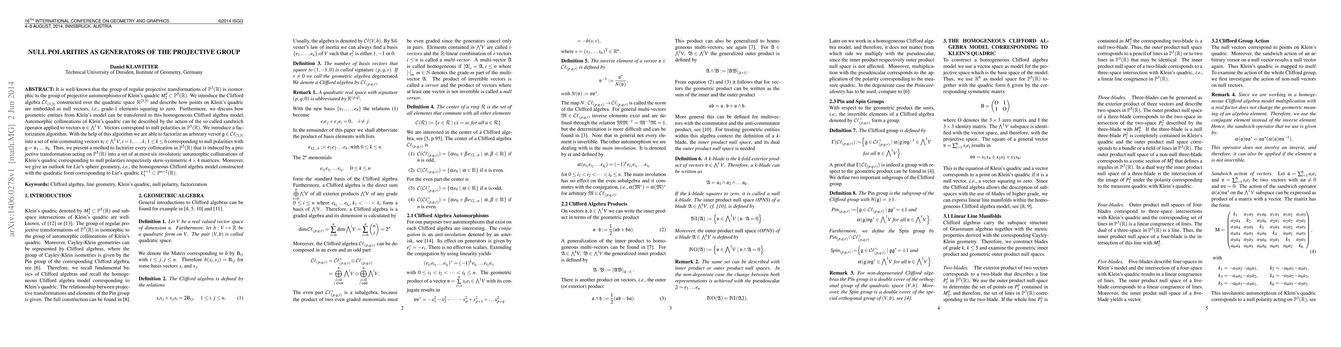 This paper explores the relationship between null polarities in projective geometry and the group of projective transformations, introducing a Clifford algebra model. It presents a factorization algorithm for versors in the algebra, enabling the decomposition of projective transformations into a set of up to six null polarities, and outlines applications to Lie's sphere geometry.