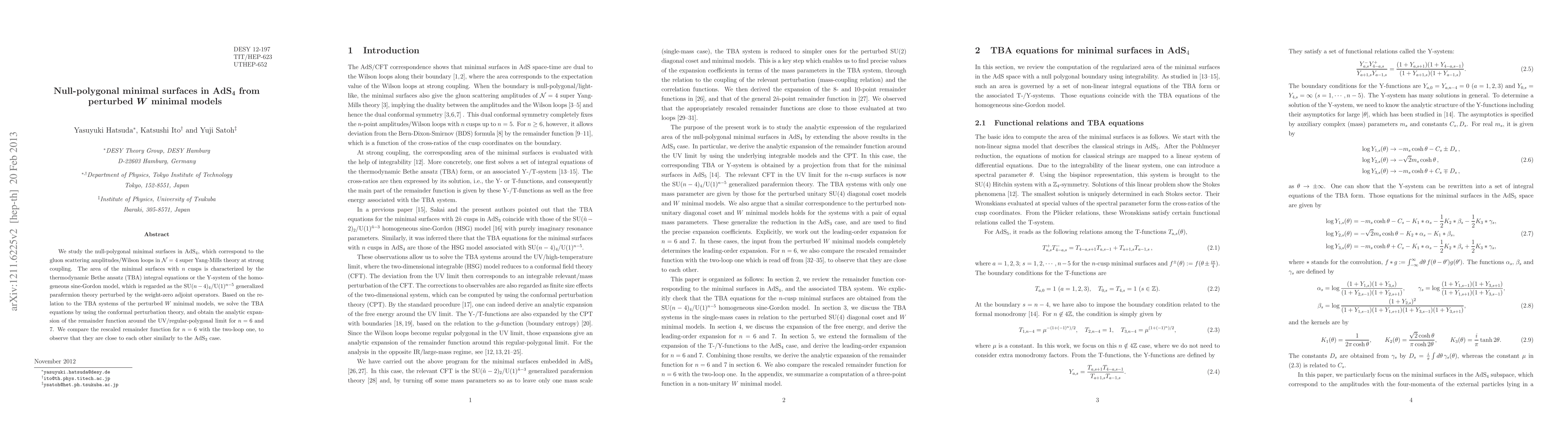 Researchers studied minimal surfaces in AdS_4 associated with gluon scattering amplitudes in strong-coupling N=4 super Yang-Mills theory. They used conformal perturbation theory to solve equations related to the thermodynamic Bethe ansatz, obtaining an analytic expansion of the remainder function for certain values of n.
