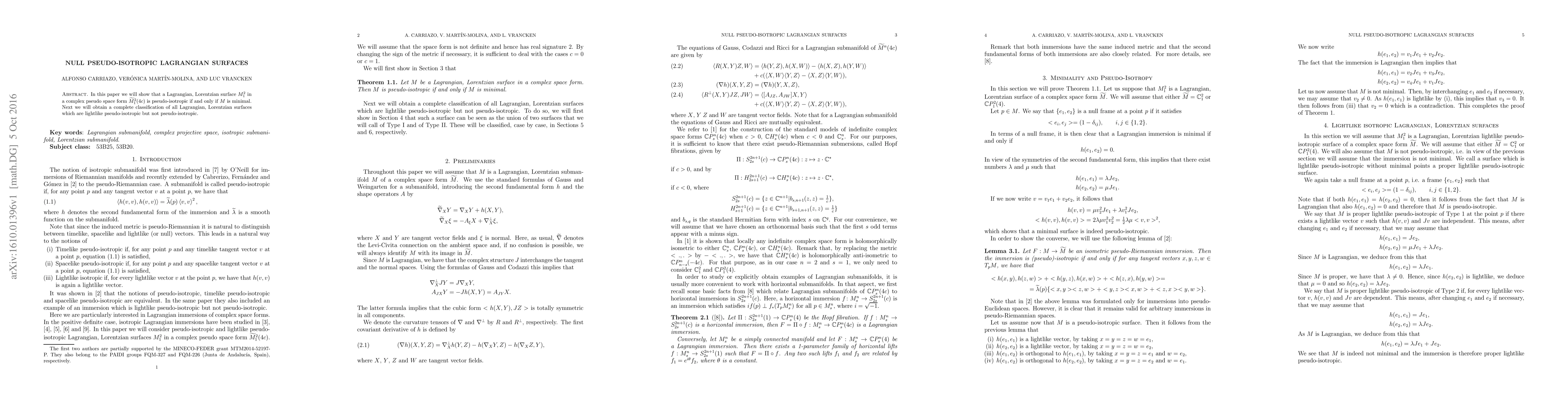A Lagrangian surface in a complex pseudo space form is pseudo-isotropic if and only if it is minimal. This paper classifies lightlike pseudo-isotropic but not pseudo-isotropic surfaces.