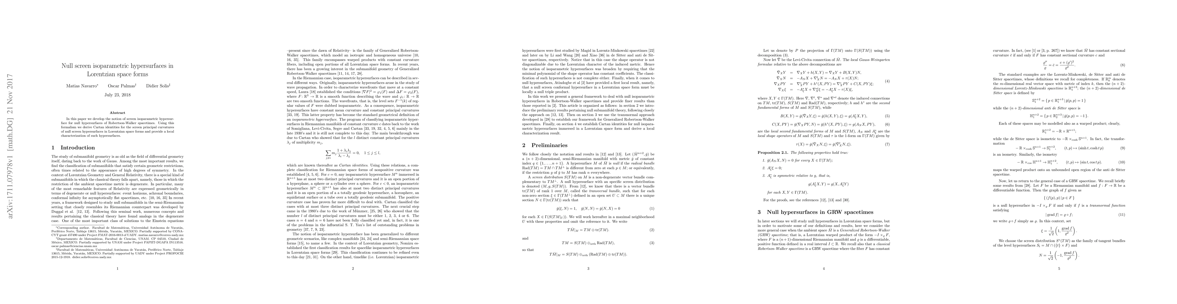 In this paper we develop the notion of screen isoparametric hypersurface for null hypersurfaces of Robertson-Walker spacetimes. Using this formalism we derive Cartan identities for the screen principal curvatures of null screen hypersurfaces in Lorentzian space forms and provide a local characterization of such hypersurfaces.