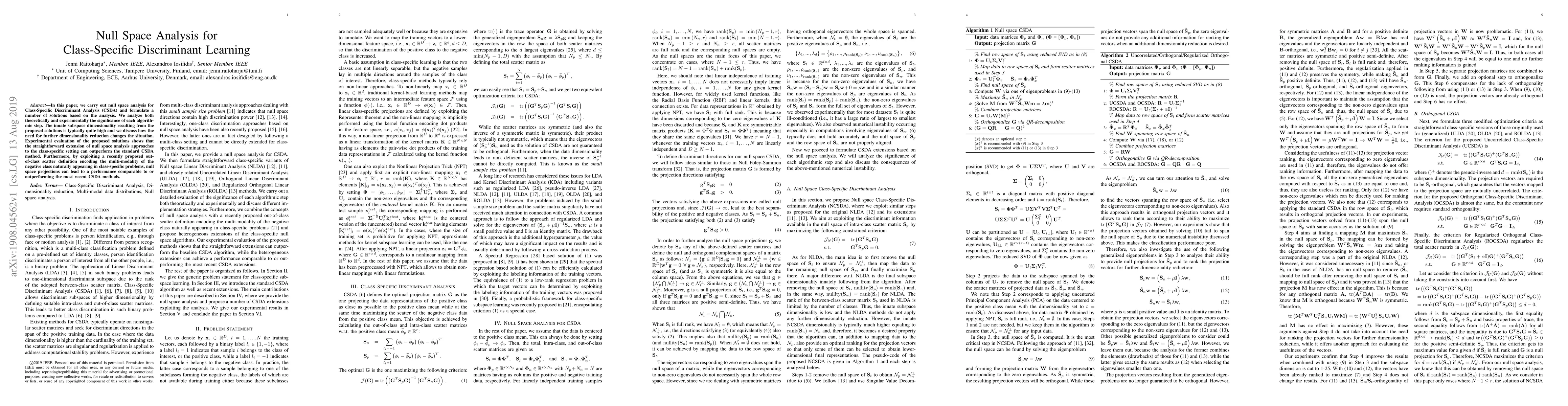 This paper proposes novel solutions for Class-Specific Discriminant Analysis (CSDA) through null space analysis, demonstrating both theoretically and experimentally that these solutions can outperform standard CSDA methods. The analysis highlights the importance of dimensionality reduction and shows that incorporating multi-modality in the out-of-class scatter can yield competitive results.