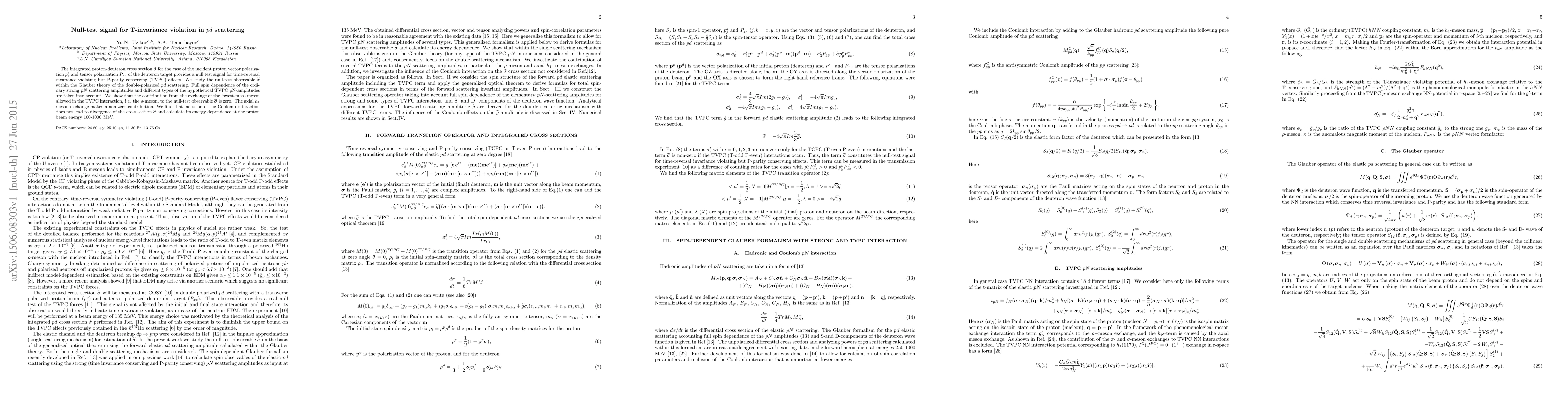 This paper investigates the null-test signal for time-reversal invariance violation in double-polarized proton-deuteron scattering using the Glauber theory. It finds that the $\rho$-meson exchange does not contribute to the null-test observable, but the axial $h_1$ meson exchange does, and the Coulomb interaction does not cause divergence in the cross section at proton beam energies of 100-1000 MeV.