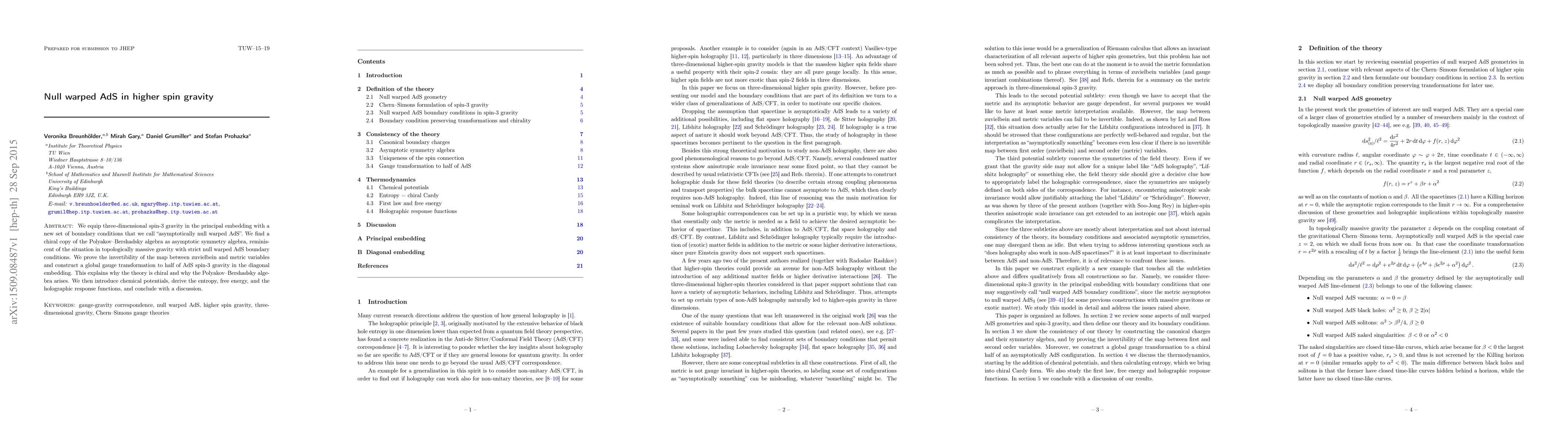 We equip three-dimensional spin-3 gravity in the principal embedding with a new set of boundary conditions that we call "asymptotically null warped AdS". We find a chiral copy of the Polyakov-Bershadsky algebra as asymptotic symmetry algebra, reminiscent of the situation in topologically massive gravity with strict null warped AdS boundary conditions. We prove the invertibility of the map between zuvielbein and metric variables and construct a global gauge transformation to half of AdS spin-3 gravity in the diagonal embedding. This explains why the theory is chiral and why the Polyakov-Bershadsky algebra arises. We then introduce chemical potentials, derive the entropy, free energy, and the holographic response functions, and conclude with a discussion.