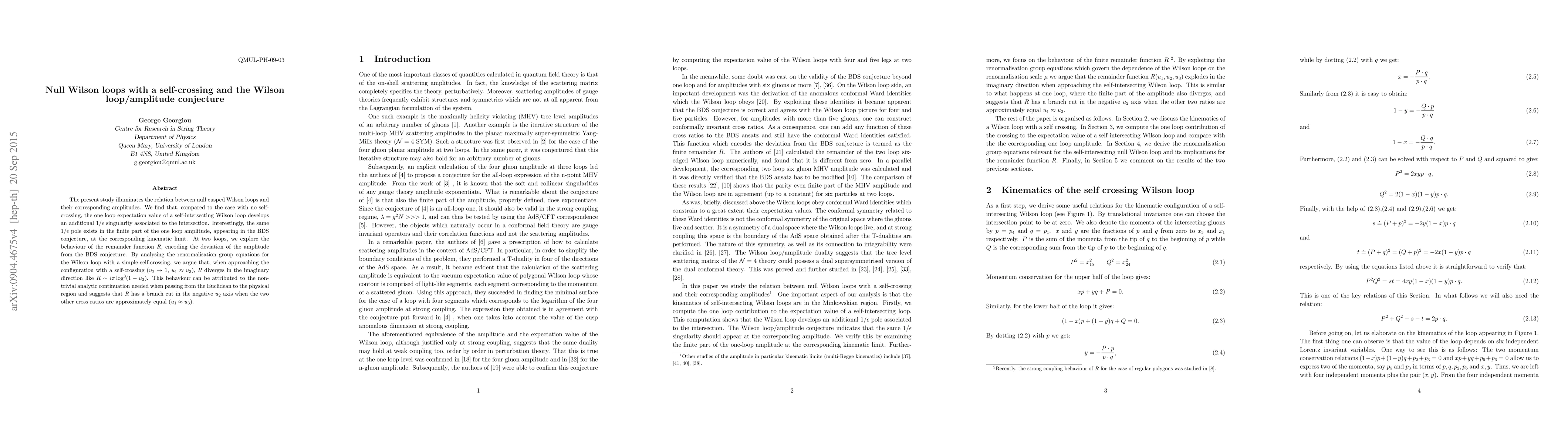The present study illuminates the relation between null cusped Wilson loops and their corresponding amplitudes. We find that, compared to the case with no self-crossing, the one loop expectation value of a self-intersecting Wilson loop develops an additional 1/\epsilon singularity associated to the intersection. Interestingly, the same 1/\epsilon pole exists in the finite part of the one loop amplitude, appearing in the BDS conjecture, at the corresponding kinematic limit. At two loops, we explore the behaviour of the remainder function R, encoding the deviation of the amplitude from the BDS conjecture. By analysing the renormalisation group equations for the Wilson loop with a simple self-crossing, we argue that, when approaching the configuration with a self-crossing (u_2 \to 1, u_1\approx u_3), R diverges in the imaginary direction like R ~ i \pi \log^3(1-u_2). This behaviour can be attributed to the non-trivial analytic continuation needed when passing from the Euclidean to the physical region and suggests that R has a branch cut in the negative u_2 axis when the two other cross ratios are approximately equal (u_1 \approx u_3).