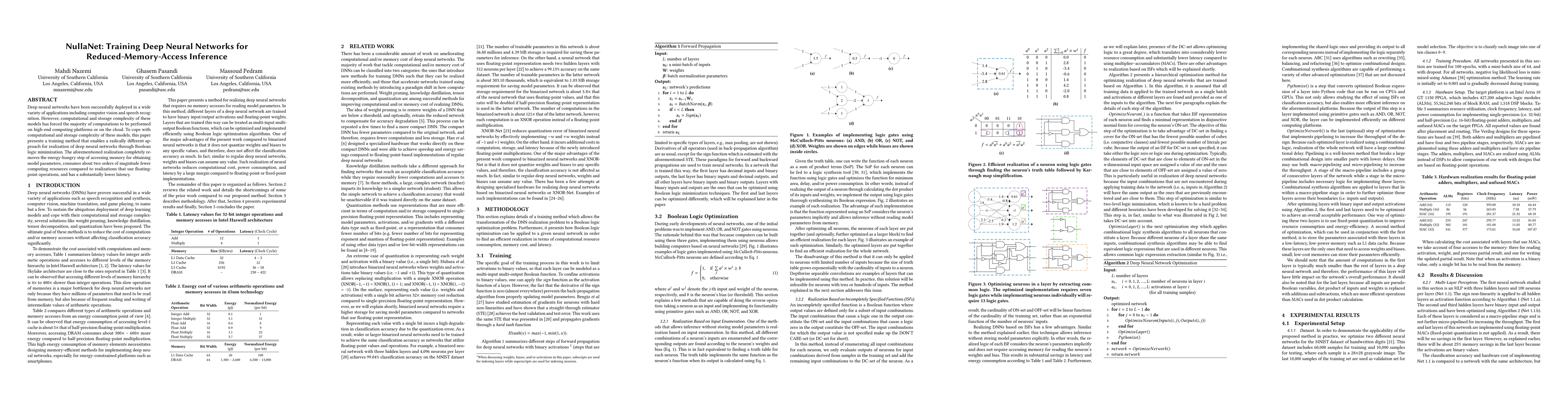 NullaNet introduces a novel training method for deep neural networks using Boolean logic minimization, eliminating memory access for model parameters and significantly reducing computational and storage complexity, leading to much lower latency and resource consumption compared to traditional floating-point operations.