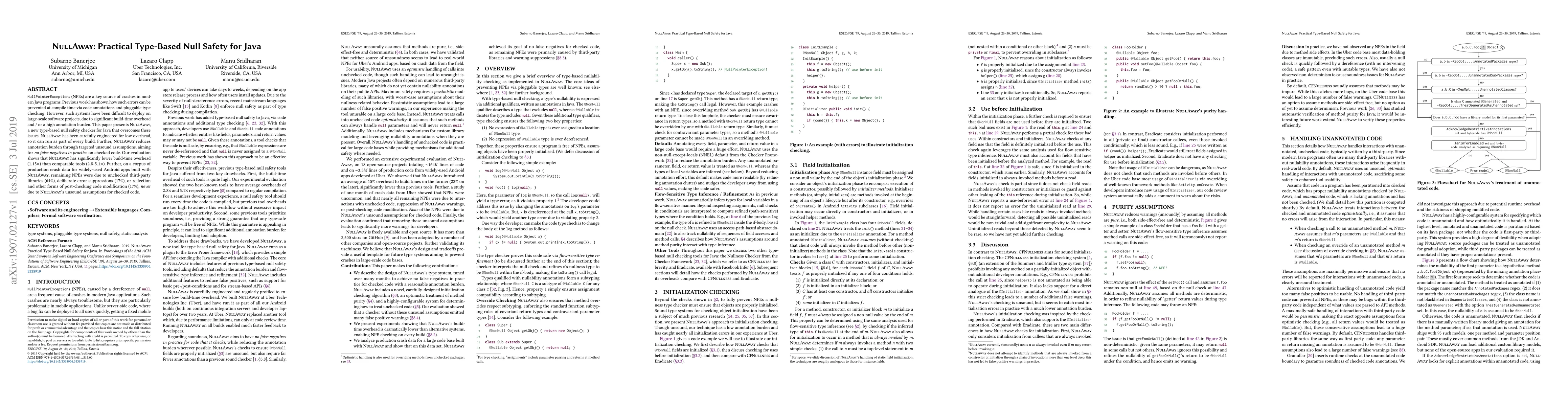 NullPointerExceptions (NPEs) are a key source of crashes in modern Java programs. Previous work has shown how such errors can be prevented at compile time via code annotations and pluggable type checking. However, such systems have been difficult to deploy on large-scale software projects, due to significant build-time overhead and / or a high annotation burden. This paper presents NullAway, a new type-based null safety checker for Java that overcomes these issues. NullAway has been carefully engineered for low overhead, so it can run as part of every build. Further, NullAway reduces annotation burden through targeted unsound assumptions, aiming for no false negatives in practice on checked code. Our evaluation shows that NullAway has significantly lower build-time overhead (1.15X) than comparable tools (2.8-5.1X). Further, on a corpus of production crash data for widely-used Android apps built with NullAway, remaining NPEs were due to unchecked third-party libraries (64%), deliberate error suppressions (17%), or reflection and other forms of post-checking code modification (17%), never due to NullAway's unsound assumptions for checked code.
