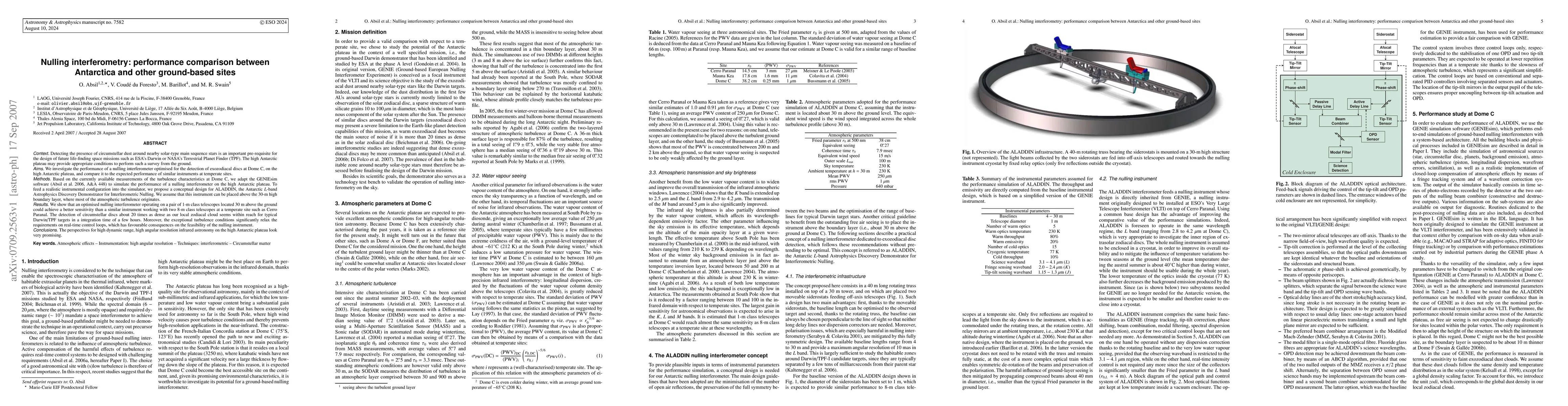 This paper compares the performance of a nulling interferometer designed to detect circumstellar dust around nearby stars, finding that the high Antarctic plateau offers better conditions than temperate sites due to lower atmospheric turbulence. The proposed ALADDIN instrument, optimized for this environment, could achieve superior sensitivity compared to similar instruments at sites like Cerro Paranal.
