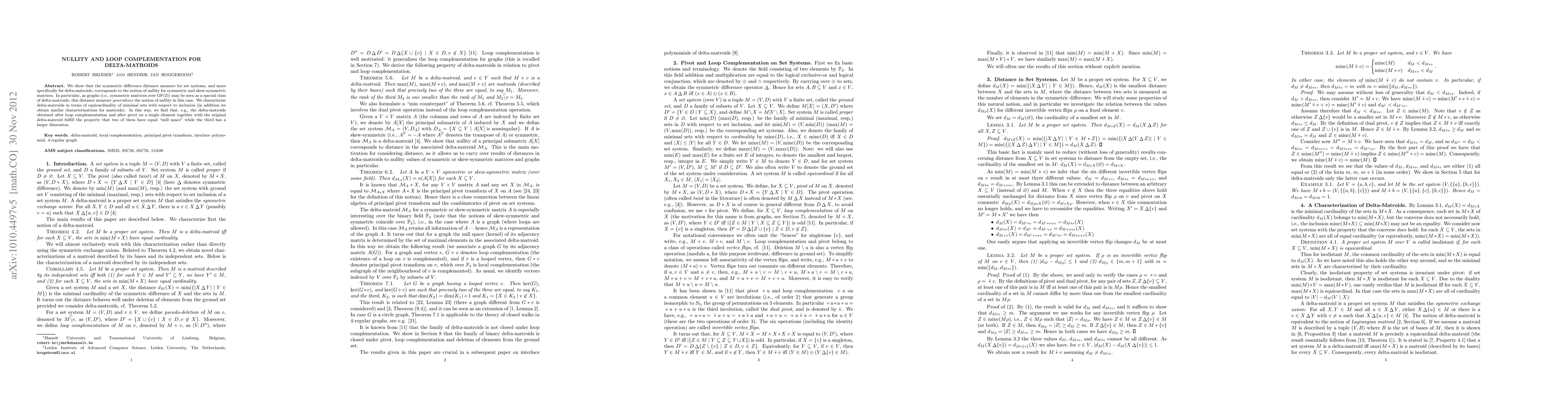 This paper demonstrates that the symmetric difference distance in delta-matroids corresponds to the nullity of symmetric and skew-symmetric matrices, extending this concept to graph theory. It characterizes delta-matroids through equicardinality of minimal sets and shows that loop complementation and pivot operations maintain this property.