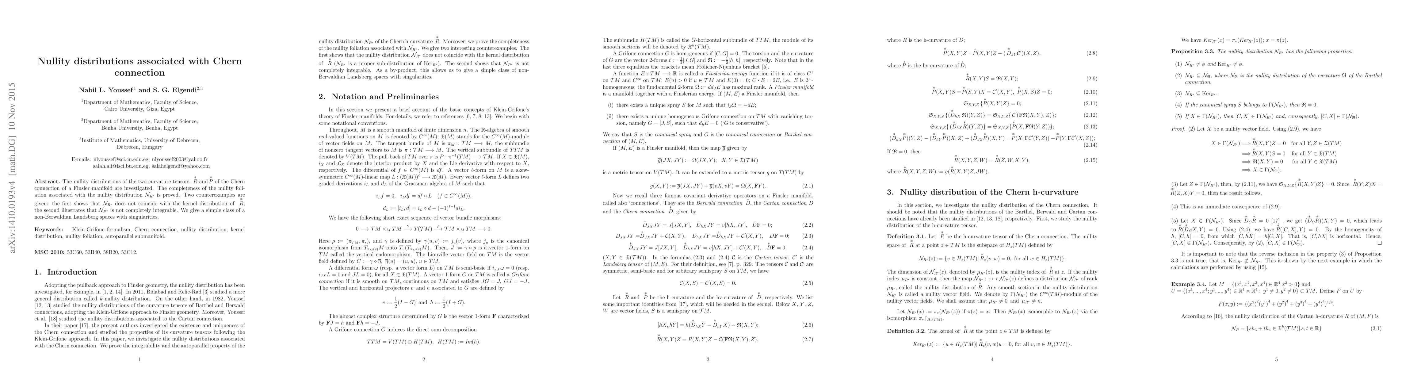 This paper investigates nullity distributions linked to the Chern connection in Finsler manifolds, proving the completeness of the nullity foliation for $\overast{R}$ but providing counterexamples showing $\N_{R^\ast}$ differs from $\overast{R}$'s kernel distribution and $\N_{P^\ast}$ is not completely integrable. It also introduces a class of non-Berwaldian Landsberg spaces with singularities.