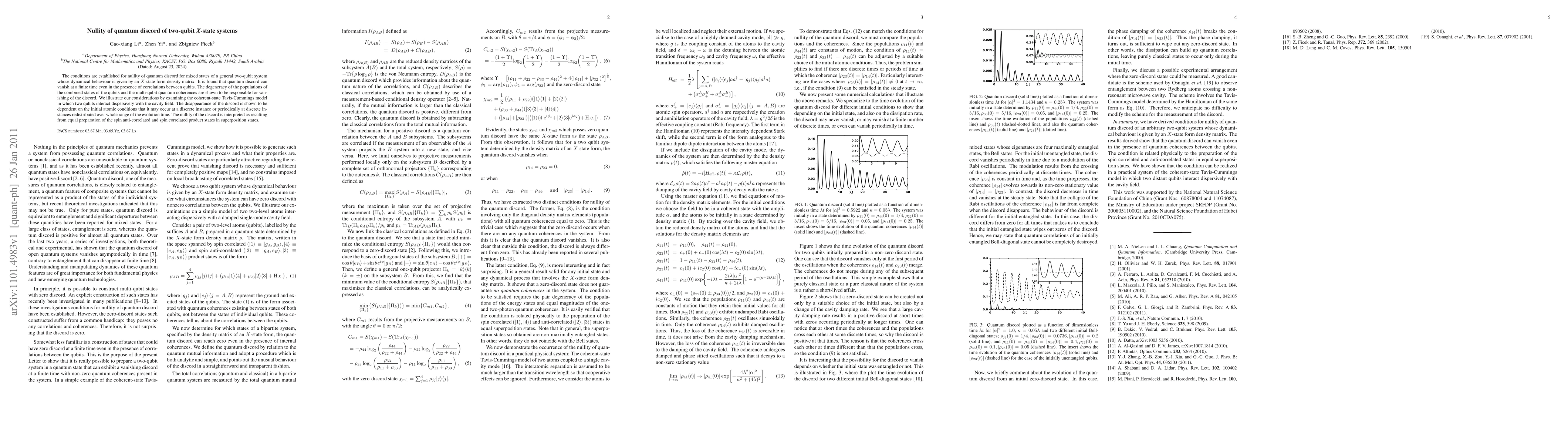 This paper establishes conditions for the nullity of quantum discord in two-qubit X-state systems, demonstrating that discord can vanish at finite times despite qubit correlations. The study attributes this phenomenon to the degeneracy of qubit populations and quantum coherences, illustrated through the coherent-state Tavis-Cummings model.