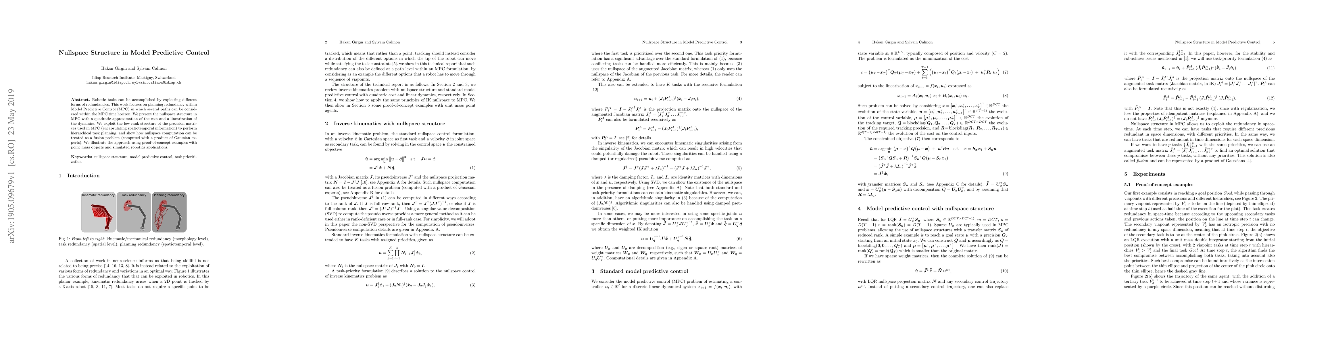 Robotic tasks can be accomplished by exploiting different forms of redundancies. This work focuses on planning redundancy within Model Predictive Control (MPC) in which several paths can be considered within the MPC time horizon. We present the nullspace structure in MPC with a quadratic approximation of the cost and a linearization of the dynamics. We exploit the low rank structure of the precision matrices used in MPC (encapsulating spatiotemporal information) to perform hierarchical task planning, and show how nullspace computation can be treated as a fusion problem (computed with a product of Gaussian experts). We illustrate the approach using proof-of-concept examples with point mass objects and simulated robotics applications.