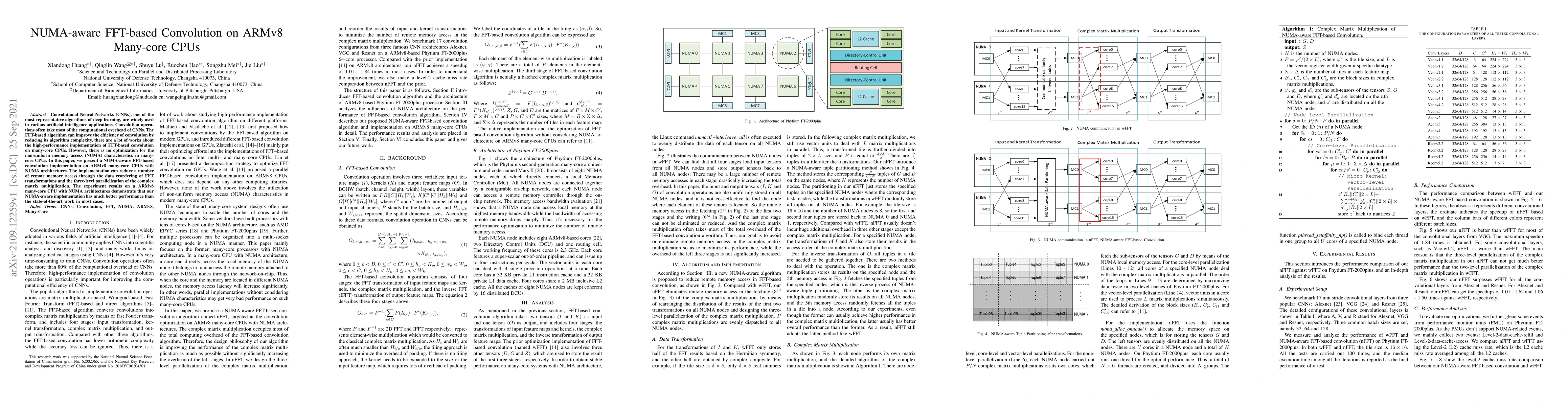 The research presents a NUMA-aware FFT-based convolution implementation on ARMv8 many-core CPUs with NUMA architectures, redesigning the parallelization of complex matrix multiplication and reordering input and kernel FFT transformation results to minimize remote memory access.