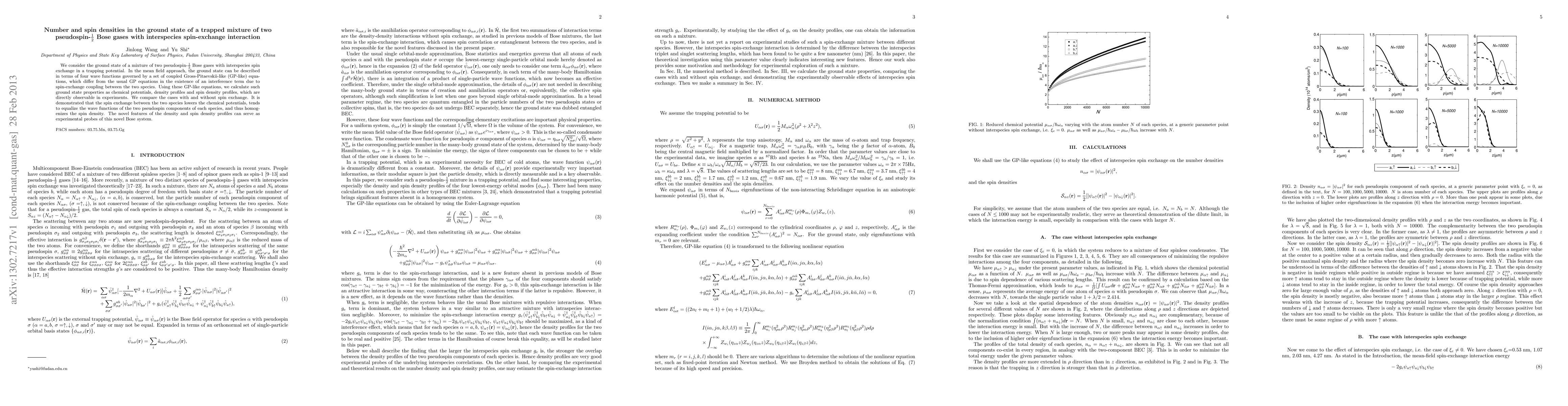 We consider the ground state of a mixture of two pseudospin-$\1/2$ Bose gases with interspecies spin exchange in a trapping potential. In the mean field approach, the ground state can be described in terms of four wave functions governed by a set of coupled Gross-Pitaevskii-like (GP-like) equations, which differ from the usual GP equations in the existence of an interference term due to spin-exchange coupling between the two species. Using these GP-like equations, we calculate such ground state properties as chemical potentials, density profiles and spin density profiles, which are directly observable in experiments. We compare the cases with and without spin exchange. It is demonstrated that the spin exchange between the two species lowers the chemical potentials, tends to equalize the wave functions of the two pseudospin components of each species, and thus homogenizes the spin density. The novel features of the density and spin density profiles can serve as experimental probes of this novel Bose system.