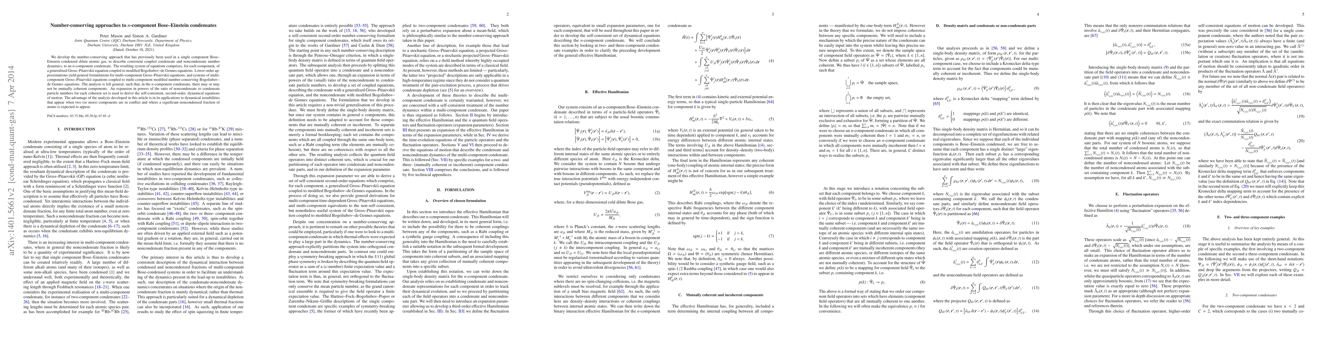 We develop the number-conserving approach that has previously been used in a single component Bose-Einstein condensed dilute atomic gas, to describe consistent coupled condensate and noncondensate number dynamics, to an $n$-component condensate. The resulting system of equations comprises, for each component, of a generalised Gross-Pitaevskii equation coupled to modified Bogoliubov-de Gennes equations. Lower-order approximations yield general formulations for multi-component Gross-Pitaevskii equations, and systems of multi-component Gross-Pitaevskii equations coupled to multi-component modified number-conserving Bogoliubov-de Gennes equations. The analysis is left general, such that, in the $n$-component condensate, there may or may not be mutually coherent components. An expansion in powers of the ratio of noncondensate to condensate particle numbers for each coherent set is used to derive the self-consistent, second-order, dynamical equations of motion. The advantage of the analysis developed in this article is in its applications to dynamical instabilities that appear when two (or more) components are in conflict and where a significant noncondensed fraction of atoms is expected to appear.