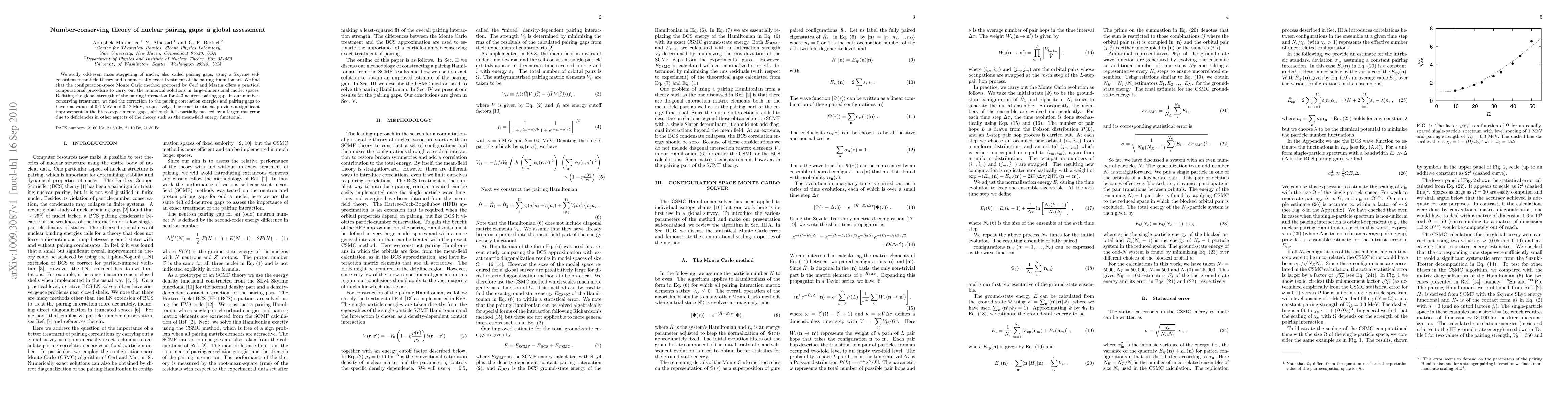 We study odd-even mass staggering of nuclei, also called pairing gaps, using a Skyrme self-consistent mean-field theory and a numerically exact treatment of the pairing Hamiltonian. We find that the configuration-space Monte Carlo method proposed by Cerf and Martin offers a practical computational procedure to carry out the numerical solutions in large-dimensional model spaces. Refitting the global strength of the pairing interaction for 443 neutron pairing gaps in our number-conserving treatment, we find the correction to the pairing correlation energies and pairing gaps to have rms values of 0.6 MeV and 0.12 MeV, respectively. The exact treatment provides a significant improvement in the fit to experimental gaps, although it is partially masked by a larger rms error due to deficiencies in other aspects of the theory such as the mean-field energy functional.
