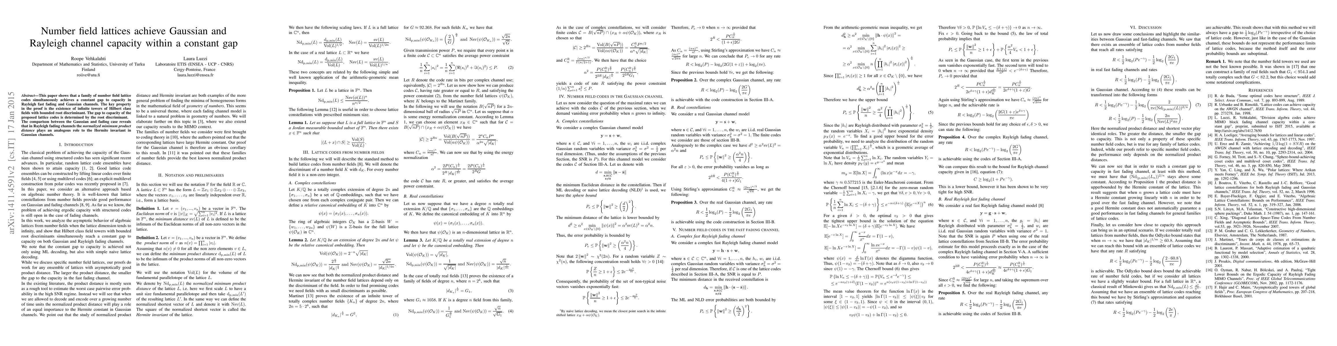 Researchers prove that number field lattice codes achieve a constant gap to channel capacity in both Gaussian and Rayleigh fading channels, with the gap determined by the root discriminant of a related mathematical concept.