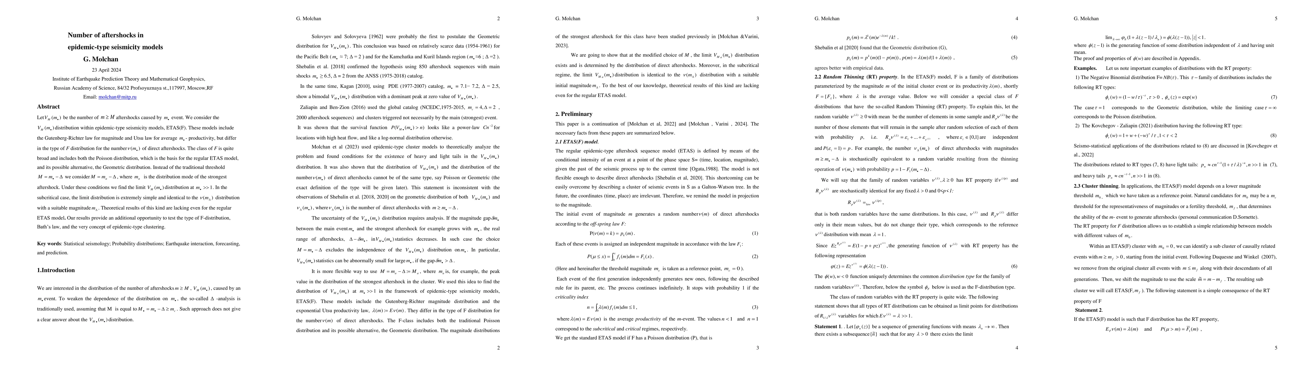 This research investigates the distribution of aftershocks $V_M,(m_0)$ in epidemic-type aftershock sequence (ETAS) models, focusing on different F distributions for direct aftershocks. It finds a simple limit distribution under specific conditions, providing valuable insights to test the underlying ETAS model assumptions.