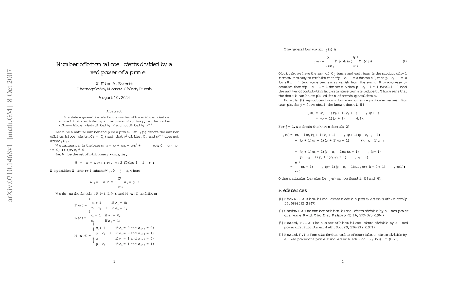 Summary: This paper presents a general formula for determining the number of binomial coefficients $\binom{n}{k}$ that are divisible by a fixed power of a prime $p$ but not by a higher power, specifically $p^j$ but not $p^{j+1}$. The findings provide a mathematical framework for analyzing such divisibility properties.