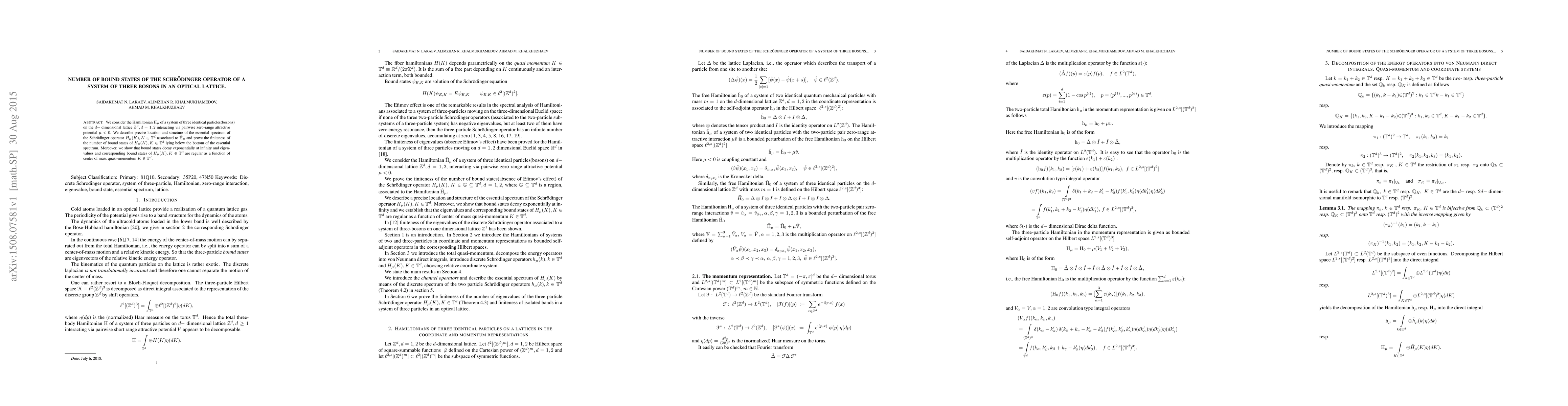 Researchers studied the behavior of three bosons in an optical lattice, finding that bound states decay exponentially at infinity and have regular properties as a function of momentum. They proved the finiteness of bound states below the essential spectrum's bottom.