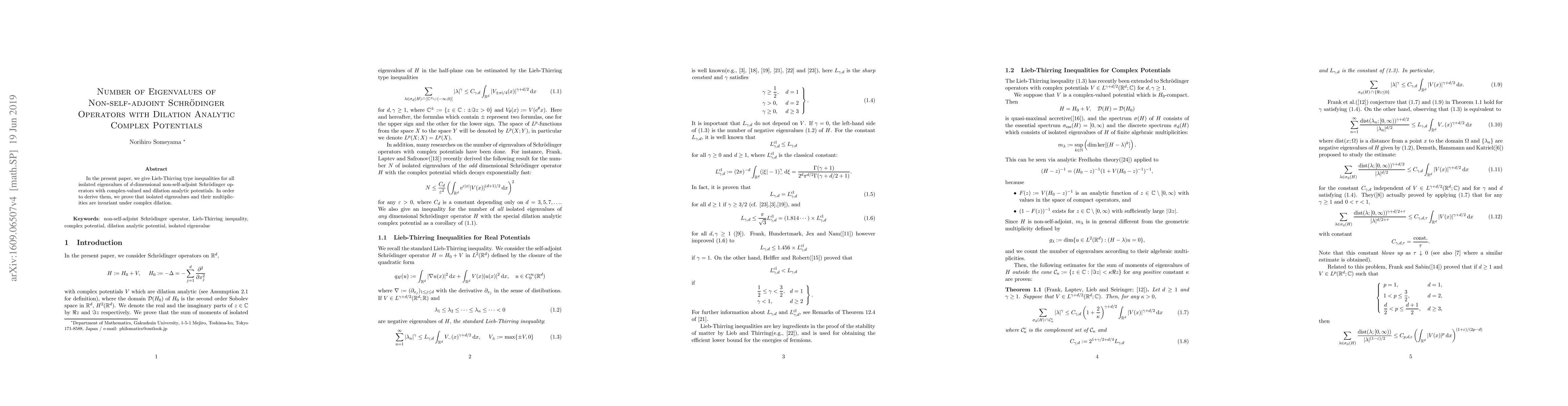Summary: This paper establishes Lieb-Thirring inequalities for isolated eigenvalues of non-selfadjoint Schrödinger operators with dilation analytic complex potentials, proving that such eigenvalues and their multiplicities remain invariant under complex dilation.