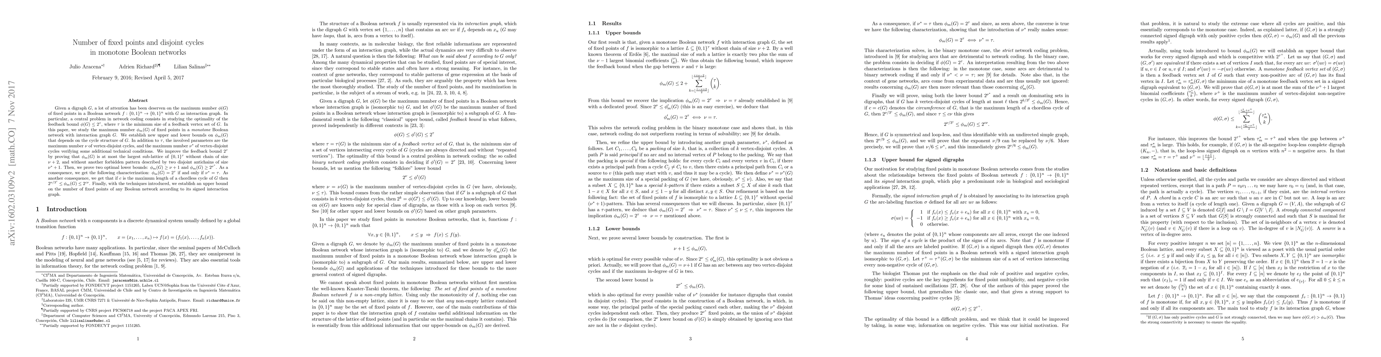 Given a digraph $G$, a lot of attention has been deserved on the maximum number $\phi(G)$ of fixed points in a Boolean network $f:\{0,1\}^n\to\{0,1\}^n$ with $G$ as interaction graph. In particular, a central problem in network coding consists in studying the optimality of the classical upper bound $\phi(G)\leq 2^{\tau}$, where $\tau$ is the minimum size of a feedback vertex set of $G$. In this paper, we study the maximum number $\phi_m(G)$ of fixed points in a {\em monotone} Boolean network with interaction graph $G$. We establish new upper and lower bounds on $\phi_m(G)$ that depends on the cycle structure of $G$. In addition to $\tau$, the involved parameters are the maximum number $\nu$ of vertex-disjoint cycles, and the maximum number $\nu^{*}$ of vertex-disjoint cycles verifying some additional technical conditions. We improve the classical upper bound $2^\tau$ by proving that $\phi_m(G)$ is at most the largest sub-lattice of $\{0,1\}^\tau$ without chain of size $\nu+1$, and without another forbidden-pattern of size $2\nu^{*}$. Then, we prove two optimal lower bounds: $\phi_m(G)\geq \nu+1$ and $\phi_m(G)\geq 2^{\nu^{*}}$. As a consequence, we get the following characterization: $\phi_m(G)=2^\tau$ if and only if $\nu^{*}=\tau$. As another consequence, we get that if $c$ is the maximum length of a chordless cycle of $G$ then $2^{\nu/3^c}\leq\phi_m(G)\leq 2^{c\nu}$. Finally, with the technics introduced, we establish an upper bound on the number of fixed points of any Boolean network according to its signed interaction graph.