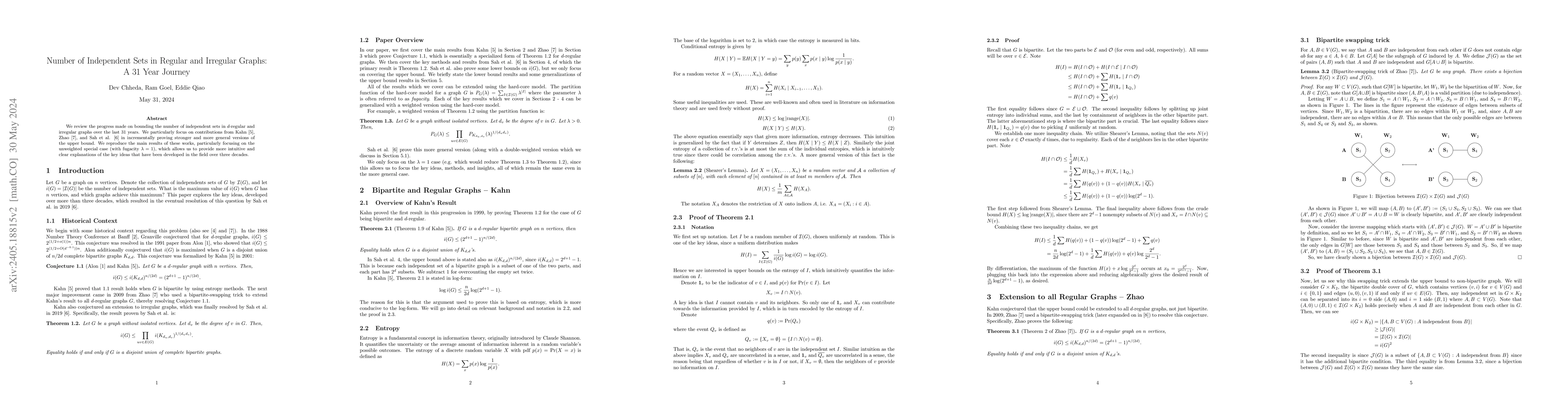 This paper reviews the significant advancements over 31 years in bounding the number of independent sets in $d$-regular and irregular graphs, highlighting contributions by Kahn, Zhao, and Sah et al. The focus is on intuitive explanations of key ideas, especially in the unweighted case with $\lambda = 1$.