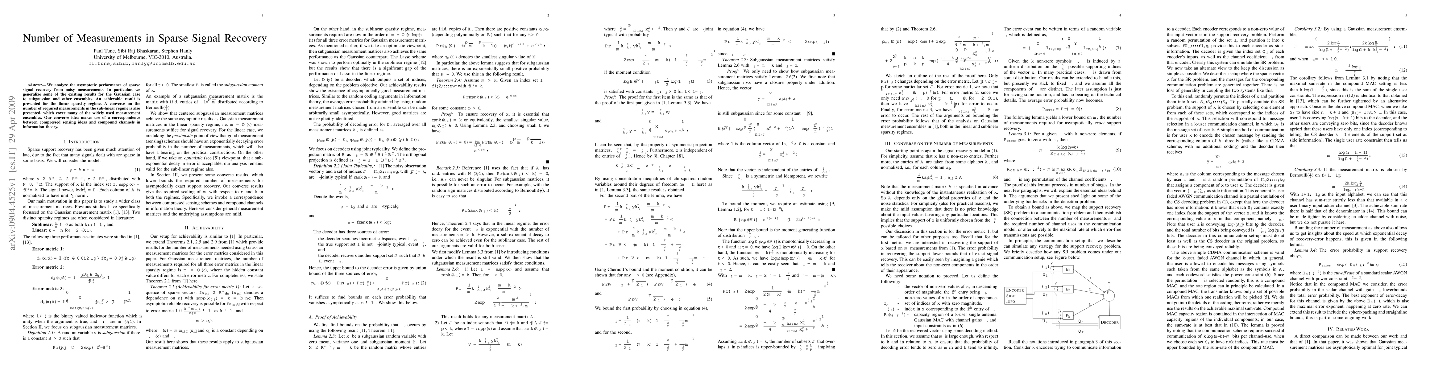 We analyze the asymptotic performance of sparse signal recovery from noisy measurements. In particular, we generalize some of the existing results for the Gaussian case to subgaussian and other ensembles. An achievable result is presented for the linear sparsity regime. A converse on the number of required measurements in the sub-linear regime is also presented, which cover many of the widely used measurement ensembles. Our converse idea makes use of a correspondence between compressed sensing ideas and compound channels in information theory.