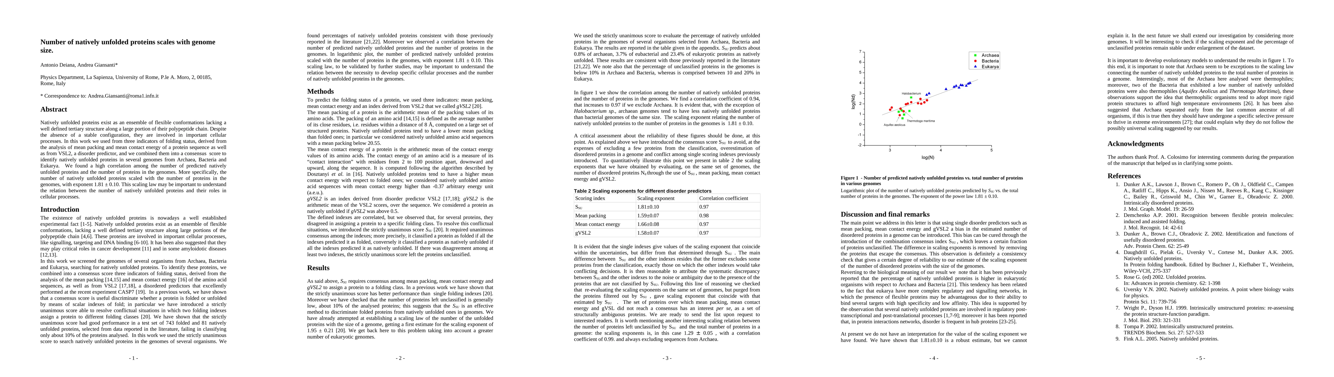 This study identifies natively unfolded proteins across various genomes using indicators of folding status and finds a strong correlation between the number of these proteins and genome size, scaling with an exponent of 1.81 ± 0.10, suggesting a significant role for these proteins in cellular processes.