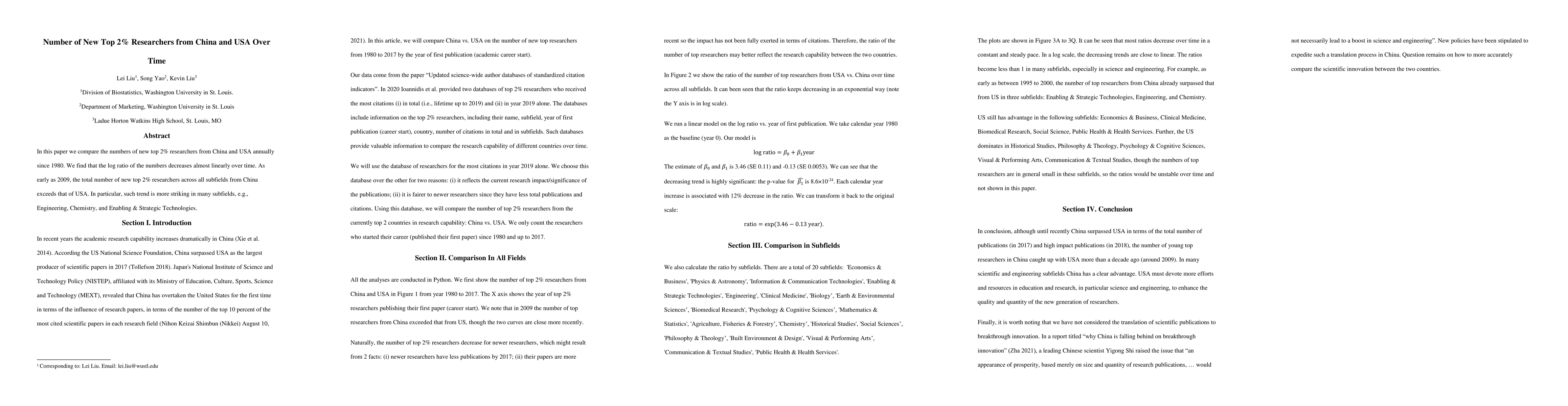 In this paper we compare the numbers of new top 2% researchers from China and USA annually since 1980. We find that the log ratio of the numbers decreases almost linearly over time. As early as 2009, the total number of new top 2% researchers across all subfields from China exceeds that of USA. In particular, such trend is more striking in many subfields, e.g., Engineering, Chemistry, and Enabling & Strategic Technologies.
