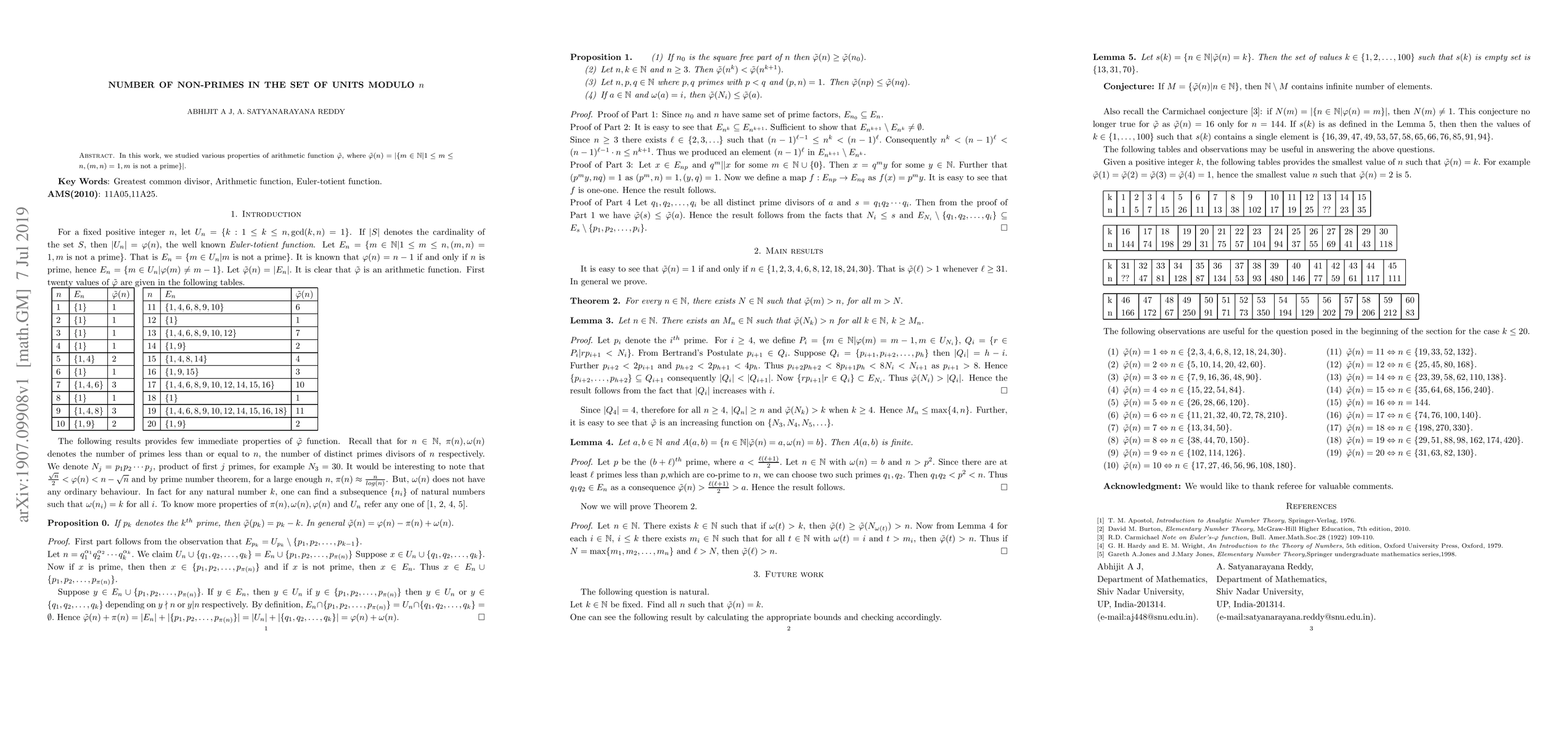 In this work, we studied various properties of arithmetic function $\tilde{\varphi}$, where $\tilde{\varphi}(n)=|\{m\in \mathbb{N} | 1\le m\le n, (m,n)=1, \mbox{$m$ is not a prime}\}|.$